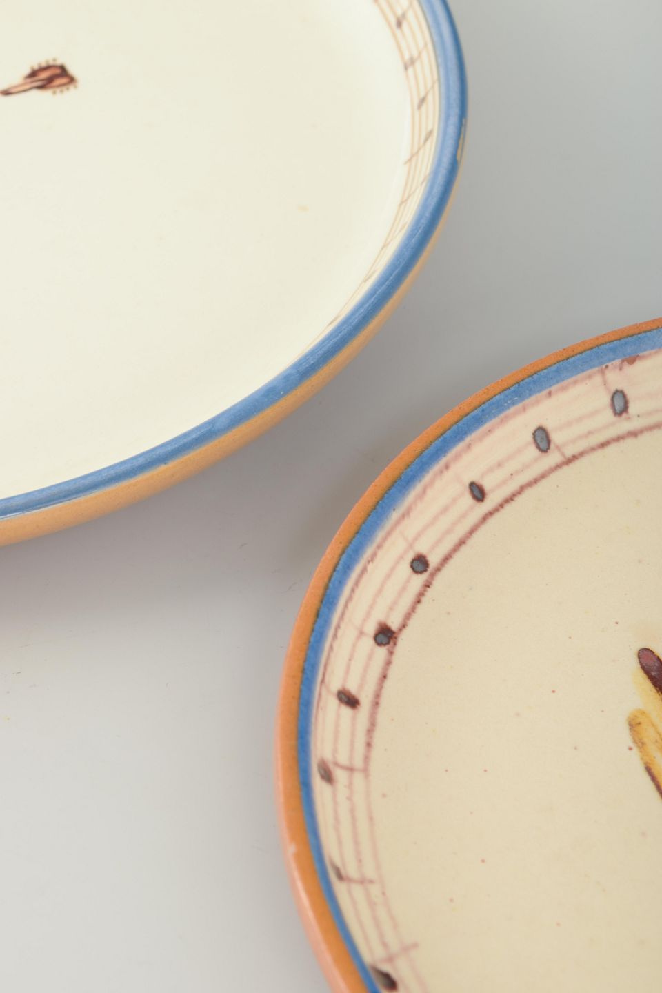 Danish ceramics from the mid-20th century are often characterised by playful and folkloristic decoration, where everyday life and traditional motifs were rendered in a simple, almost naïve style. These plates represent a combination of functional tableware and decorative craftsmanship, today sought after by collectors for their period charm and cultural significance.