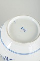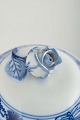 Organisk formet lågkande i hvidt porcelæn med underglasur-blå dekoration i det klassiske “Zwiebelmuster”-mønster. Låget er prydet med en naturalistisk modelleret porcelænsrose i blå og hvid.