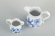 Organisk formede porcelænskander med hvid grundglasur og håndmalet blå blomsterdekor i underglasur. Klassisk bølget rand og svungen hank.