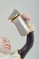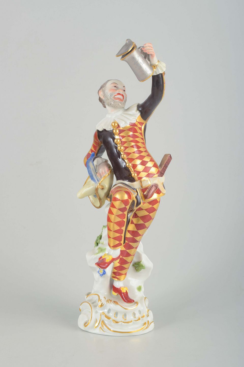 Pragtfuld og detaljerig porcelænsfigur af Harlekin i klassisk Commedia dell’arte-dragt, udført i de fineste farver med overdådig håndmalet staffering i rødt, guld og sort. Figuren skildrer Harlekin i festlig positur med løftet krus, rigt dekoreret med gulddetaljer og stående på en rokoko-inspireret base med blomster.