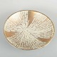 Wheel-thrown stoneware bowl with organic form. Interior decorated with radiating white and golden glaze pattern on a light brown base. Exterior with dark, almost black glaze.