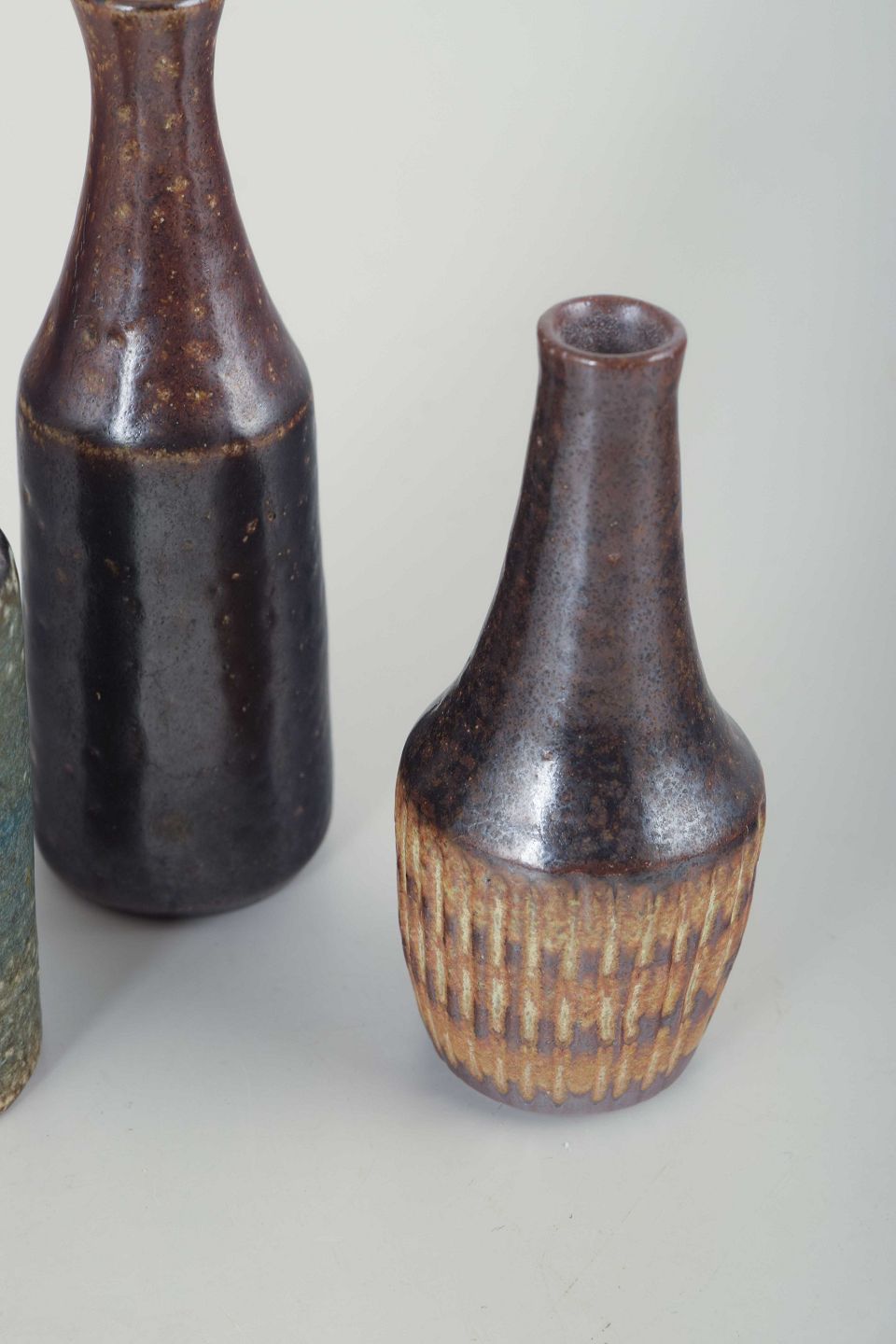 Organisk formede vaser i drejet stentøj med rå overflader og glasurer i brune, sorte og blå-grønne toner.