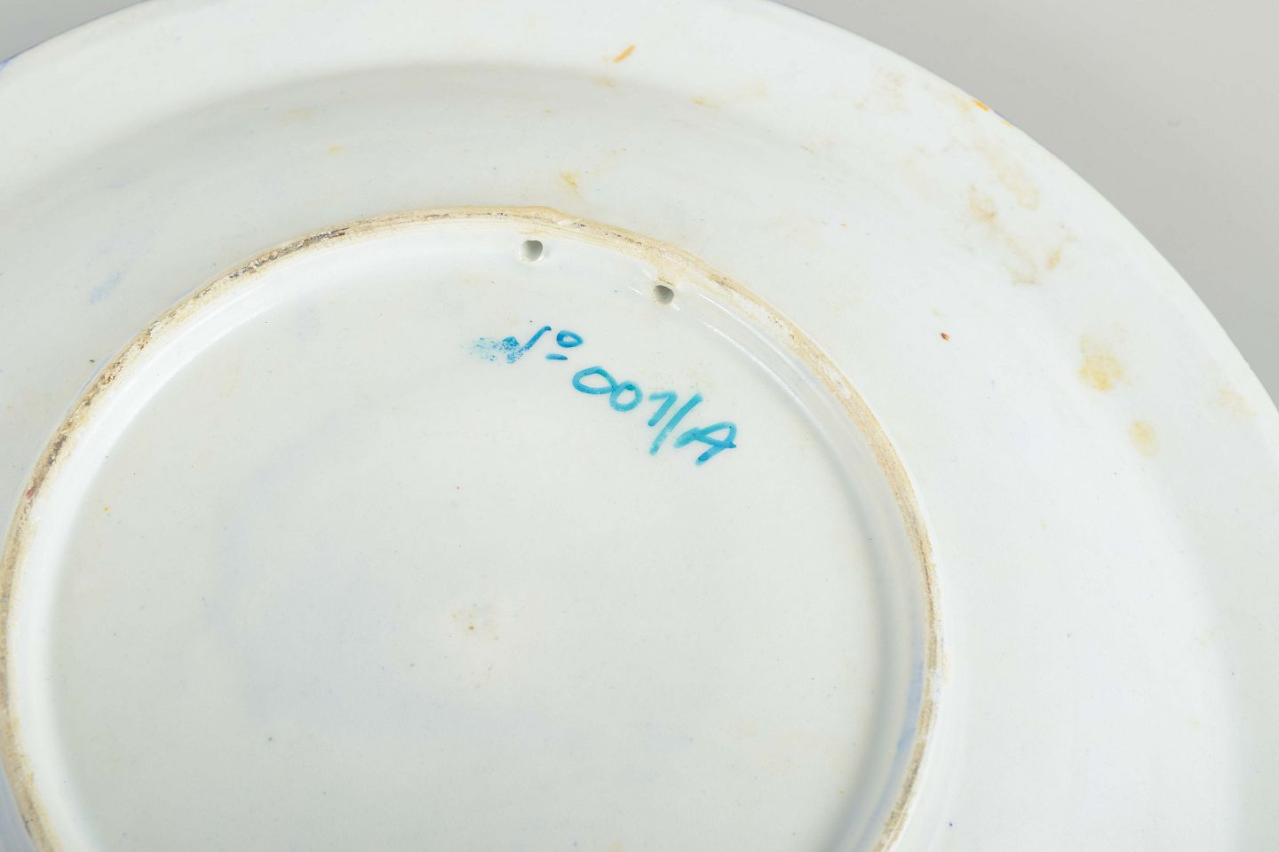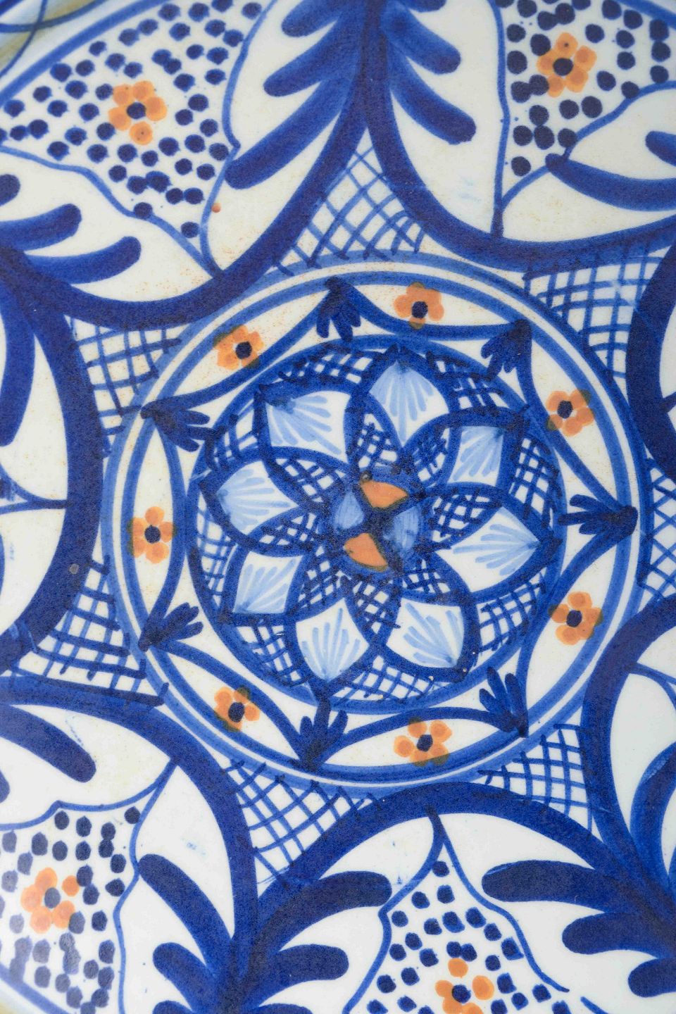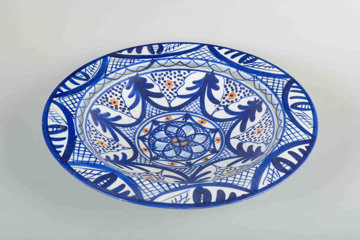 Wheel-thrown faience dish with hand-painted decoration in blue, orange and white tones. Geometric and floral pattern with strong folkloristic traits.