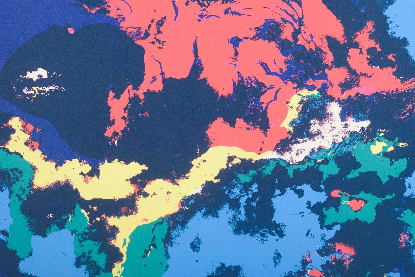 Et ekspressivt abstrakt tryk med organiske, farvemættede flader i blå, rød, grøn og gule nuancer. Kompositionen er præget af rytmiske bevægelser og kontraster, som skaber en levende og dynamisk billedflade, karakteristisk for Ernsts arbejde med farver og organiske udtryk.