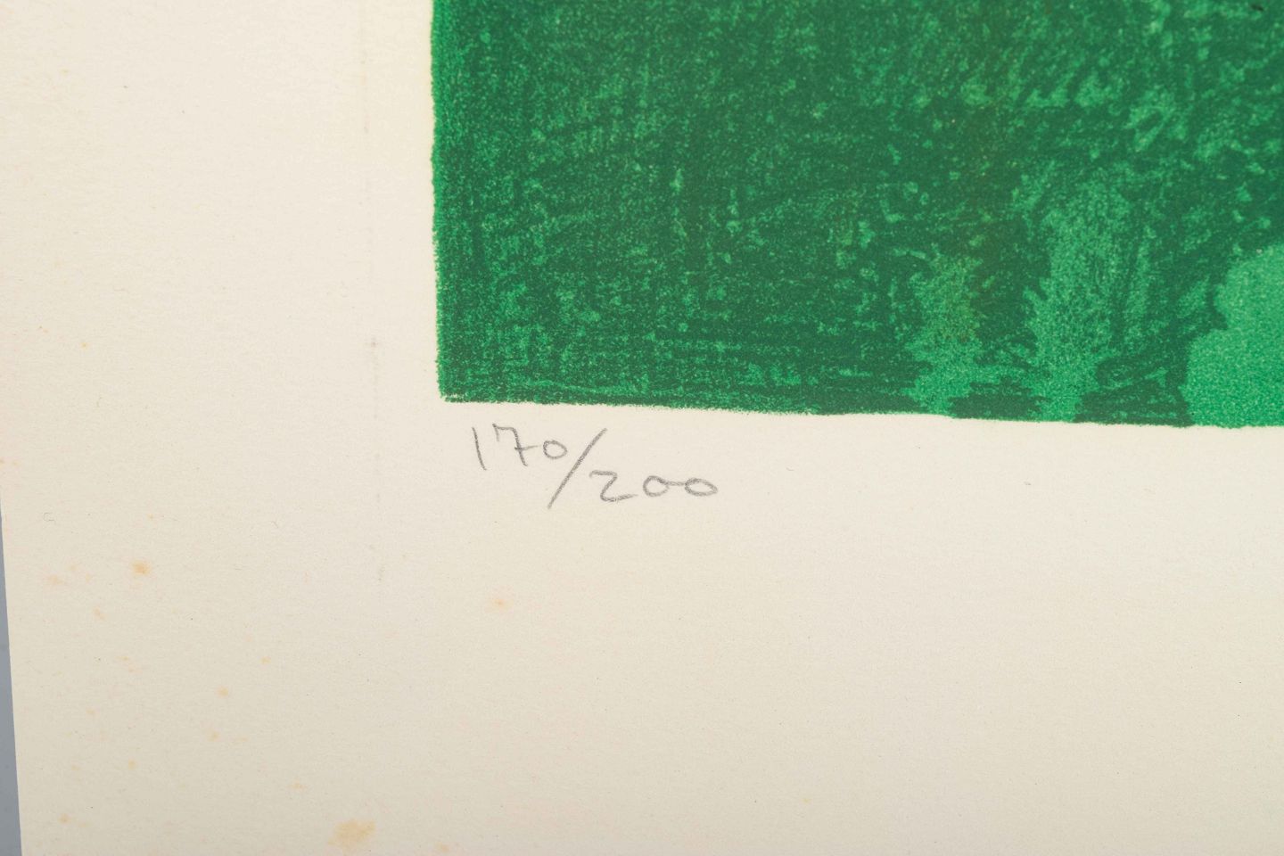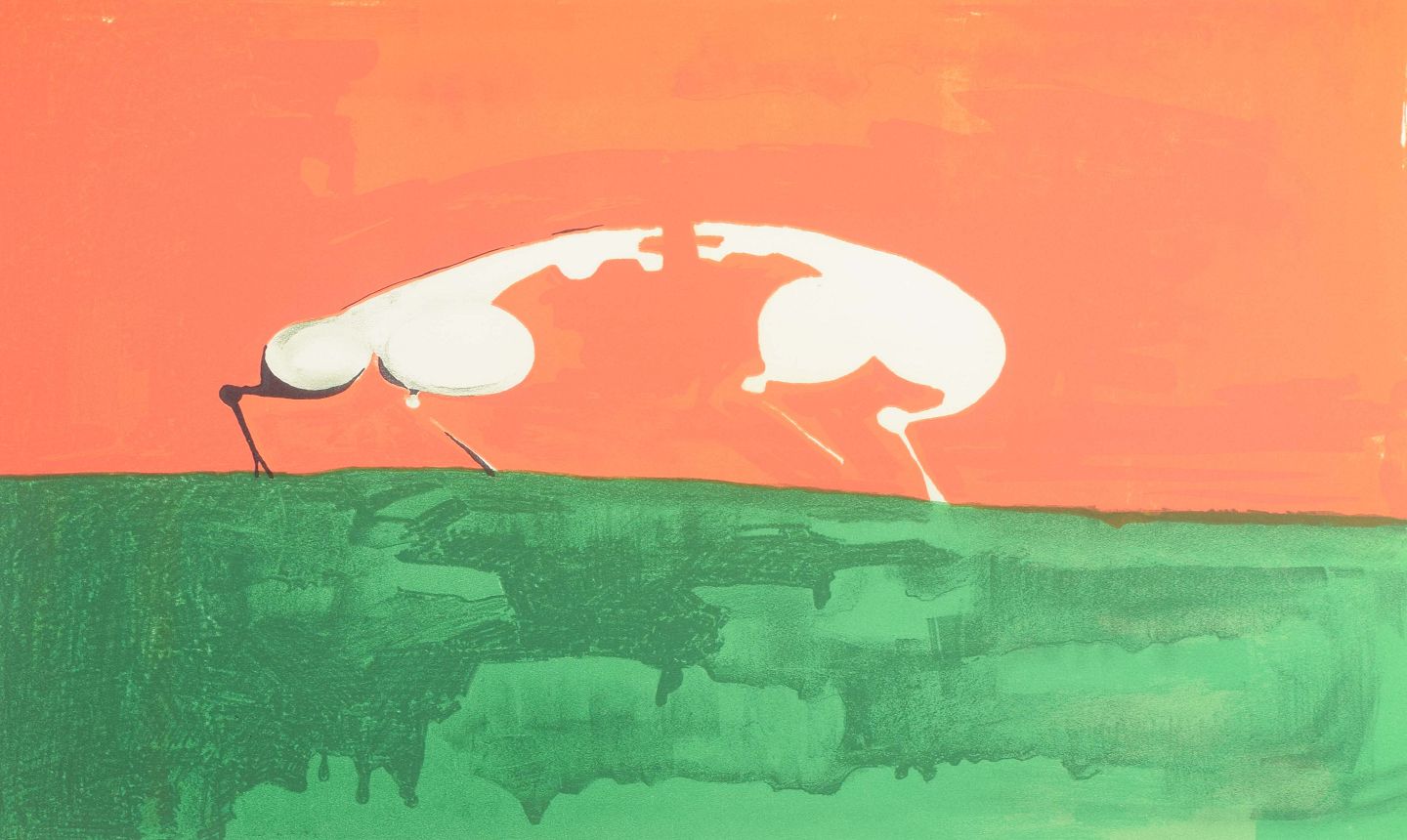 To stiliserede fugle i hvid silhuet, placeret mod en stærk orange baggrund og grøn forgrund. Den enkle, men kraftfulde farvekontrast skaber en dynamisk og poetisk stemning. Værket er nummereret 170/200 og signeret samt dateret 1969.