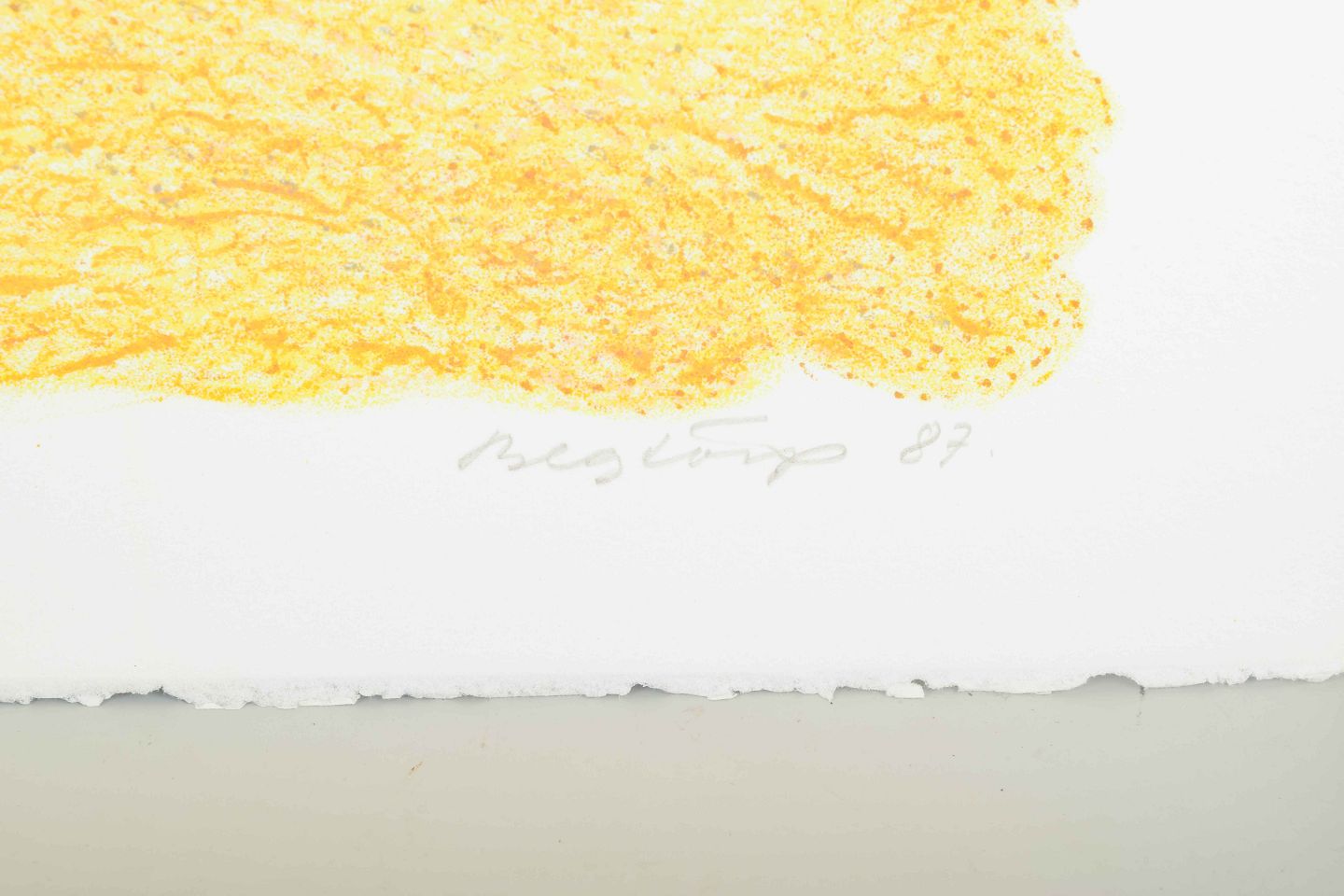 Abstrakt farvelitografi med organiske og bølgende former i gule og gyldne nuancer, der danner et stemningsfuldt landskab.