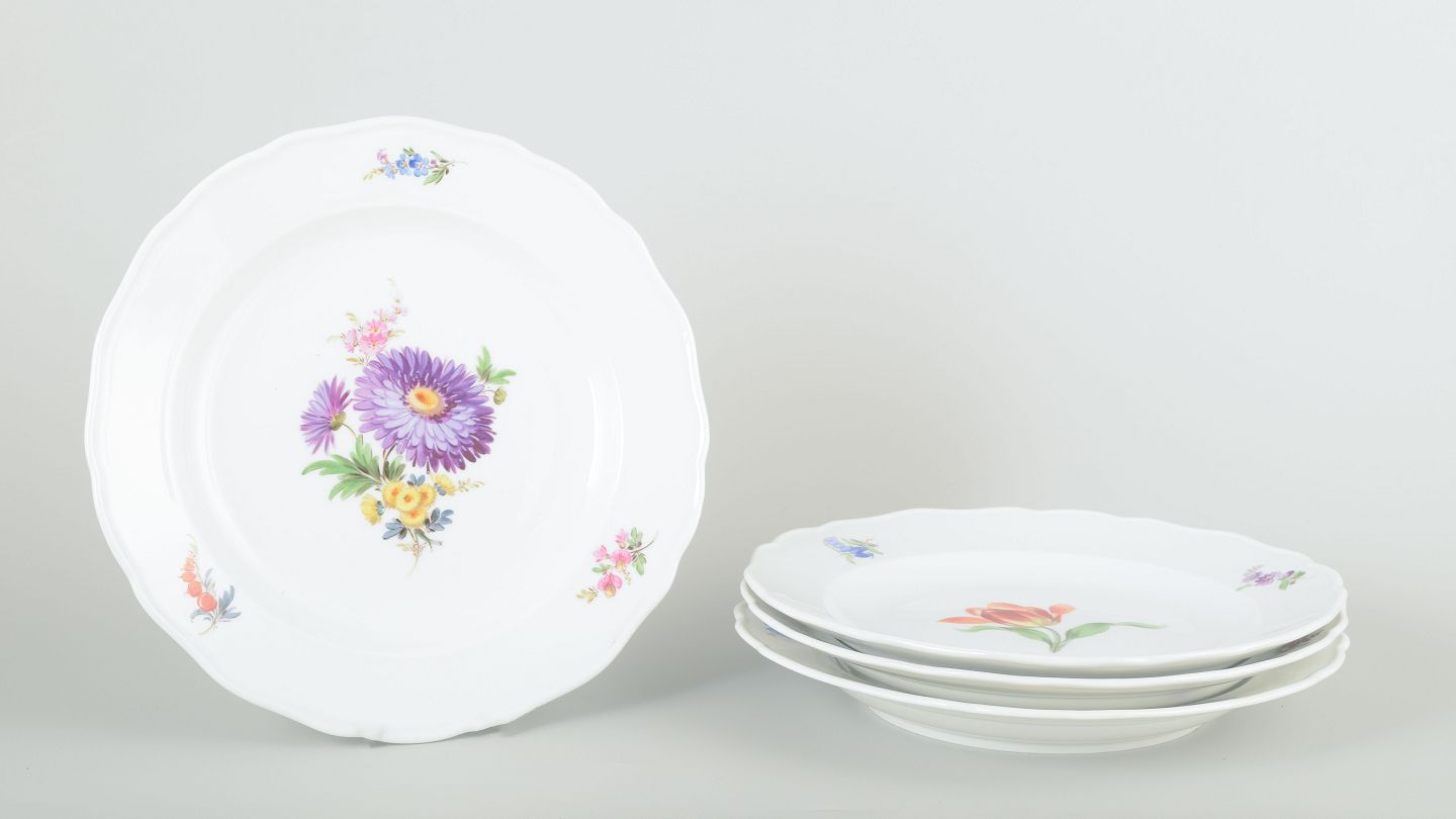 Stand: Flot stand med lette brugsspor. Én tallerken i 1. sortering, tre annulleret med to indridsede streger. Alle tallerkener stemplet med Meissens korslagte sværd.