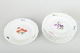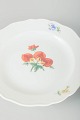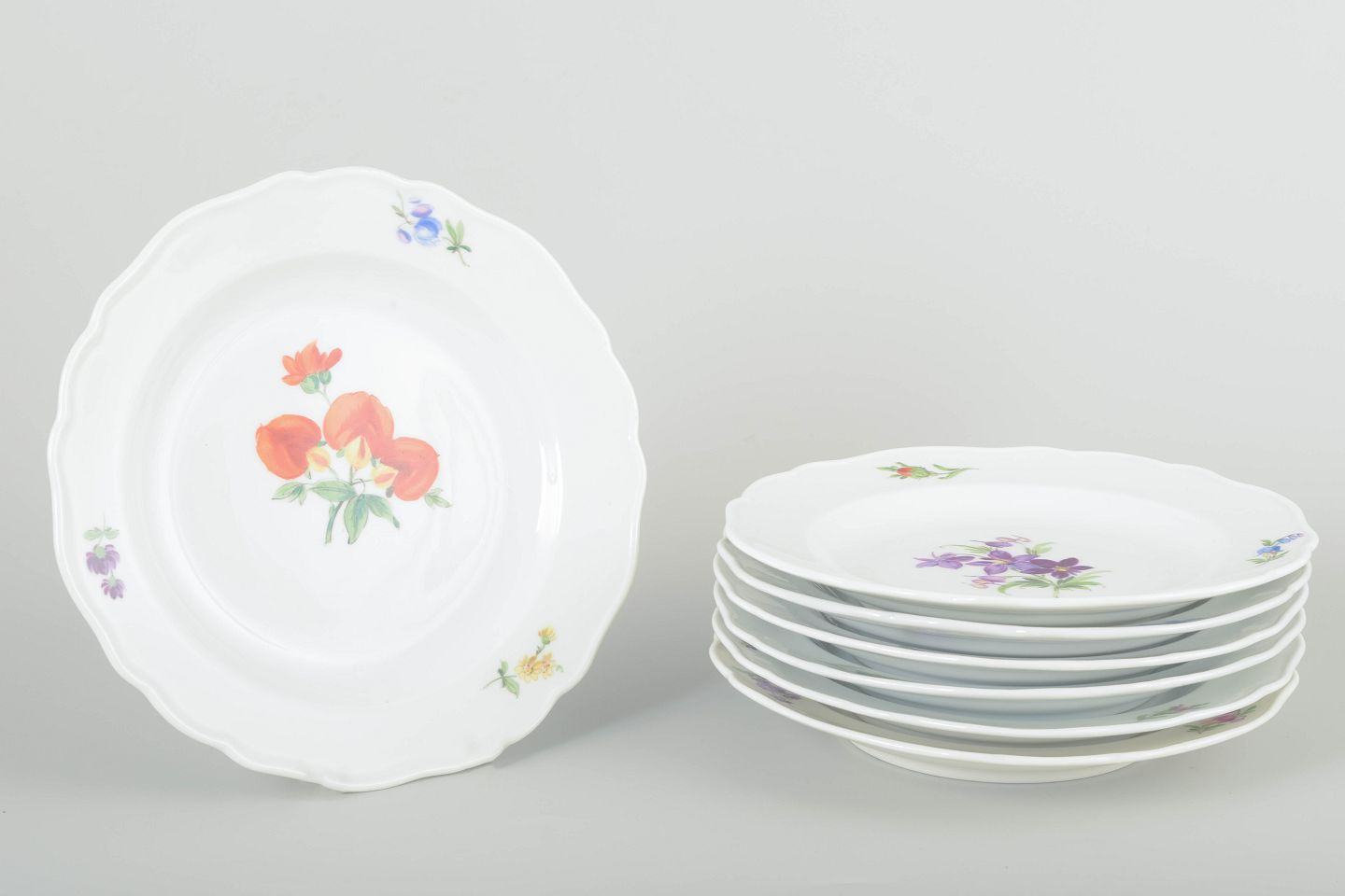 Syv tallerkener i porcelæn, håndmalede med blomsterdekorationer i flerfarvet palet. Klassisk bølget kantprofil med relief og delikat staffering.