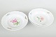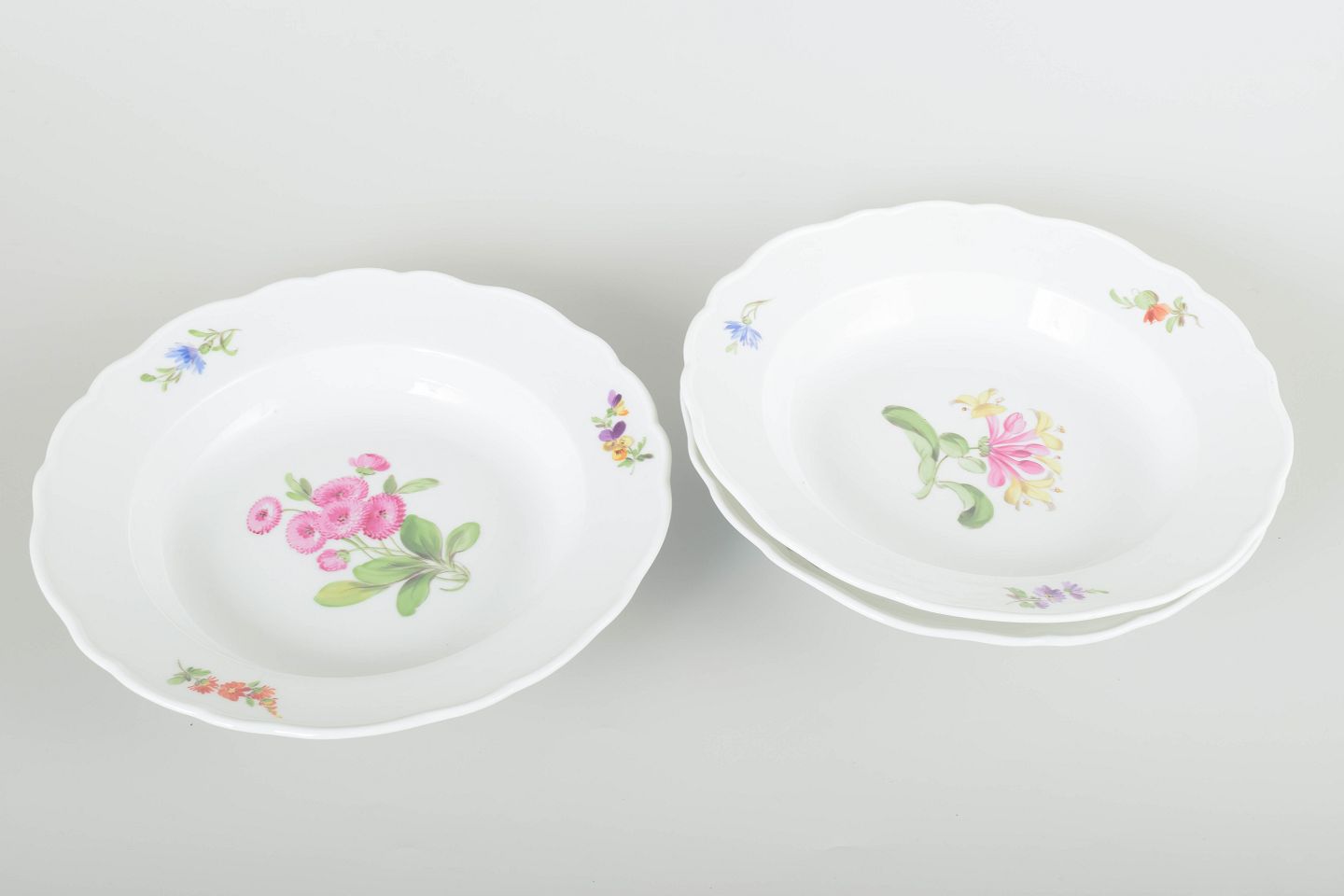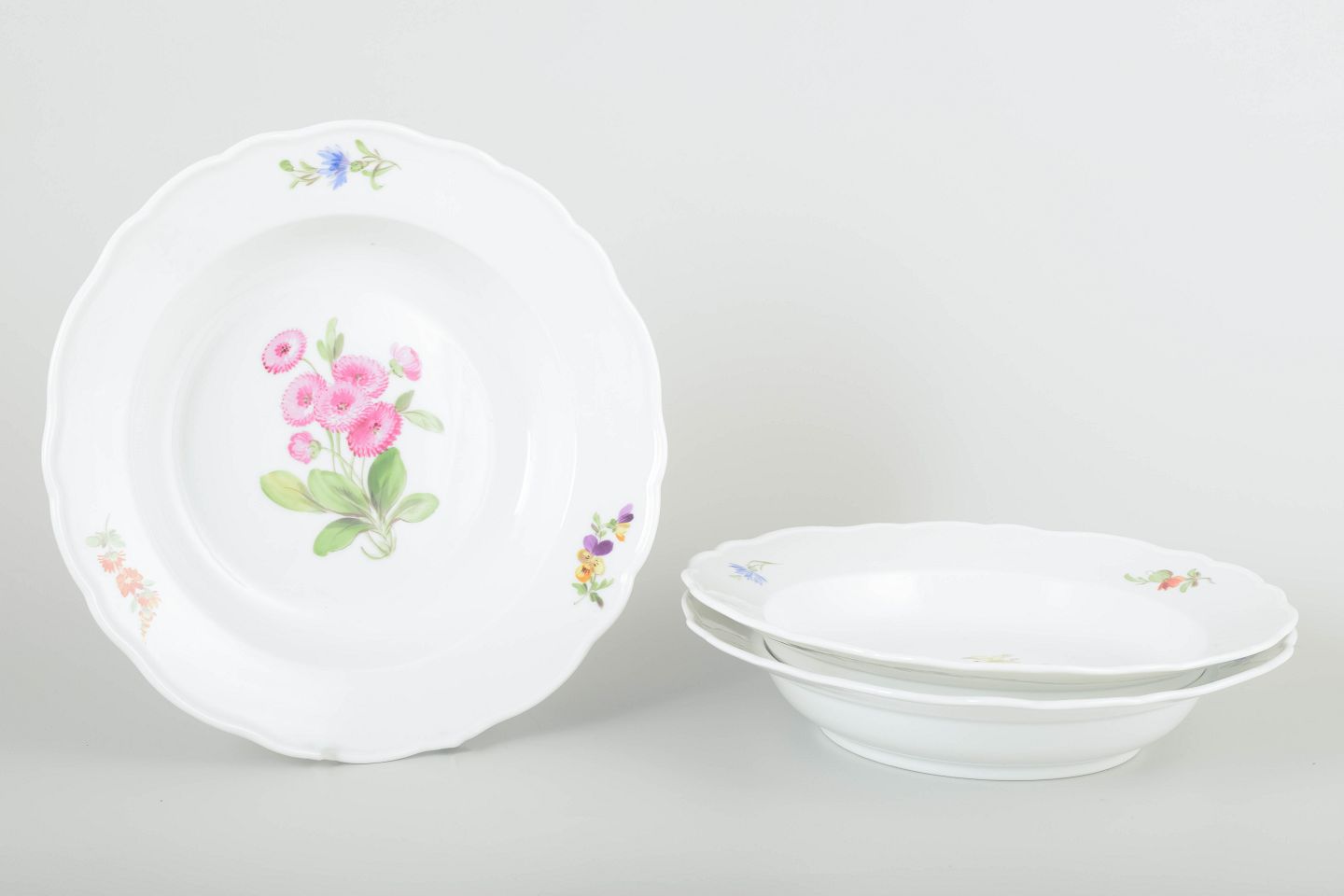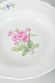 Tre dybe tallerkener i porcelæn, håndmalede med blomsterdekorationer i flerfarvet palet. Klassisk bølget kantprofil med relief og delikat staffering.