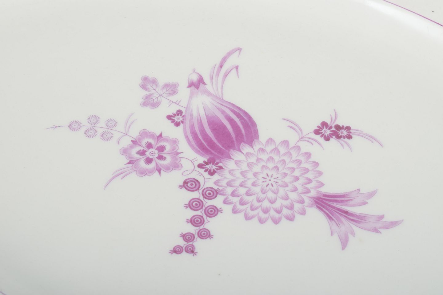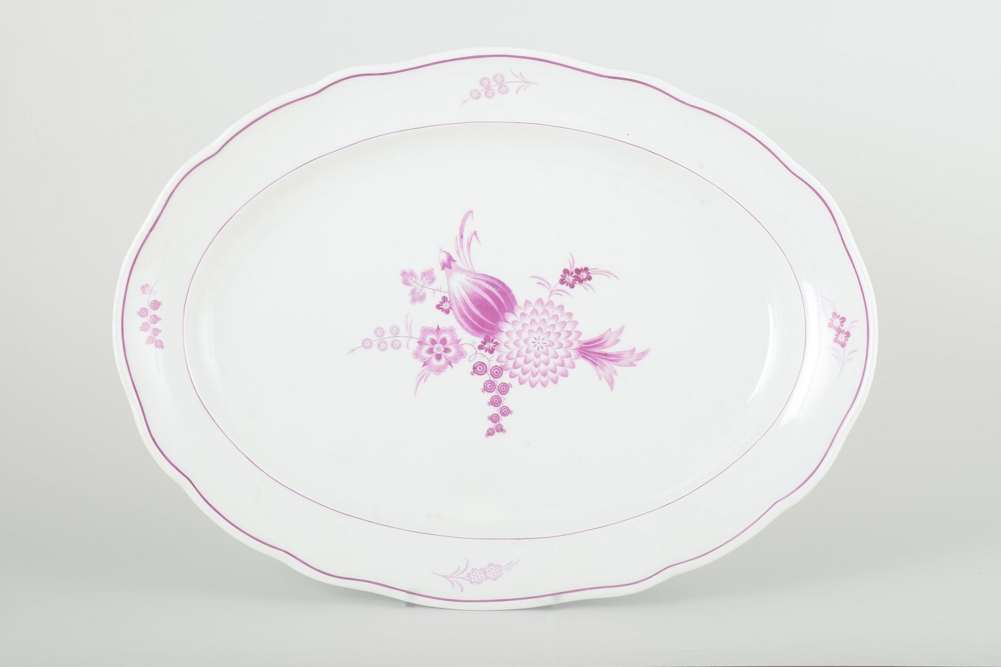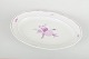 Stort håndmalet ovalt serveringsfad i porcelæn med dekor i lilla blomsterkompositioner og let bølget kant. Klassisk Meissen-design med elegant rosa staffering, ideelt til servering eller som dekorativt midtpunkt.