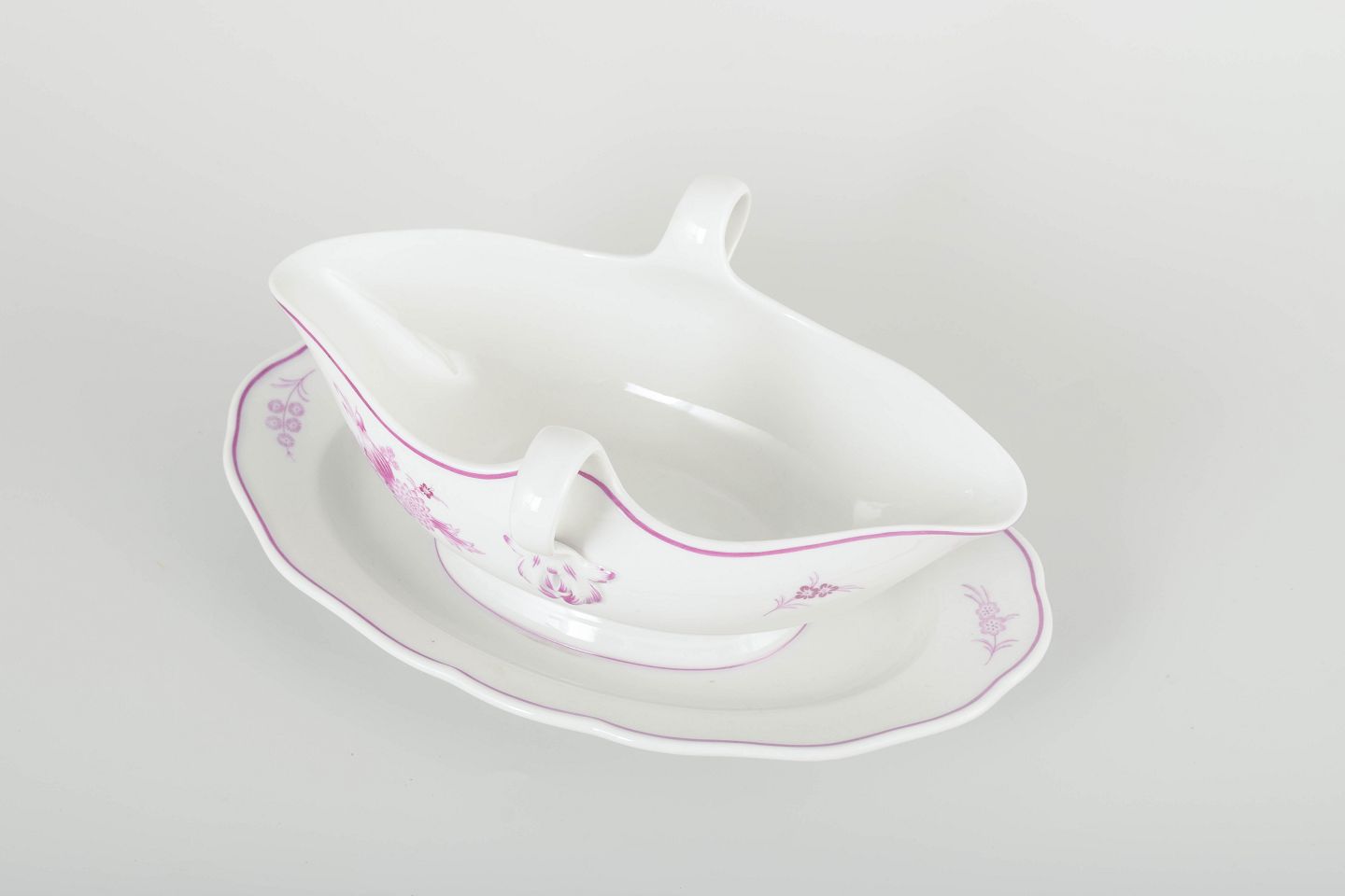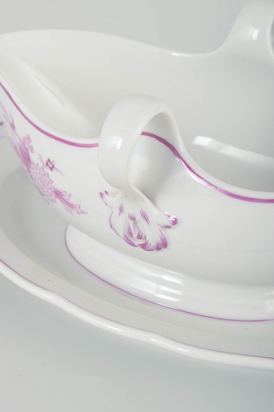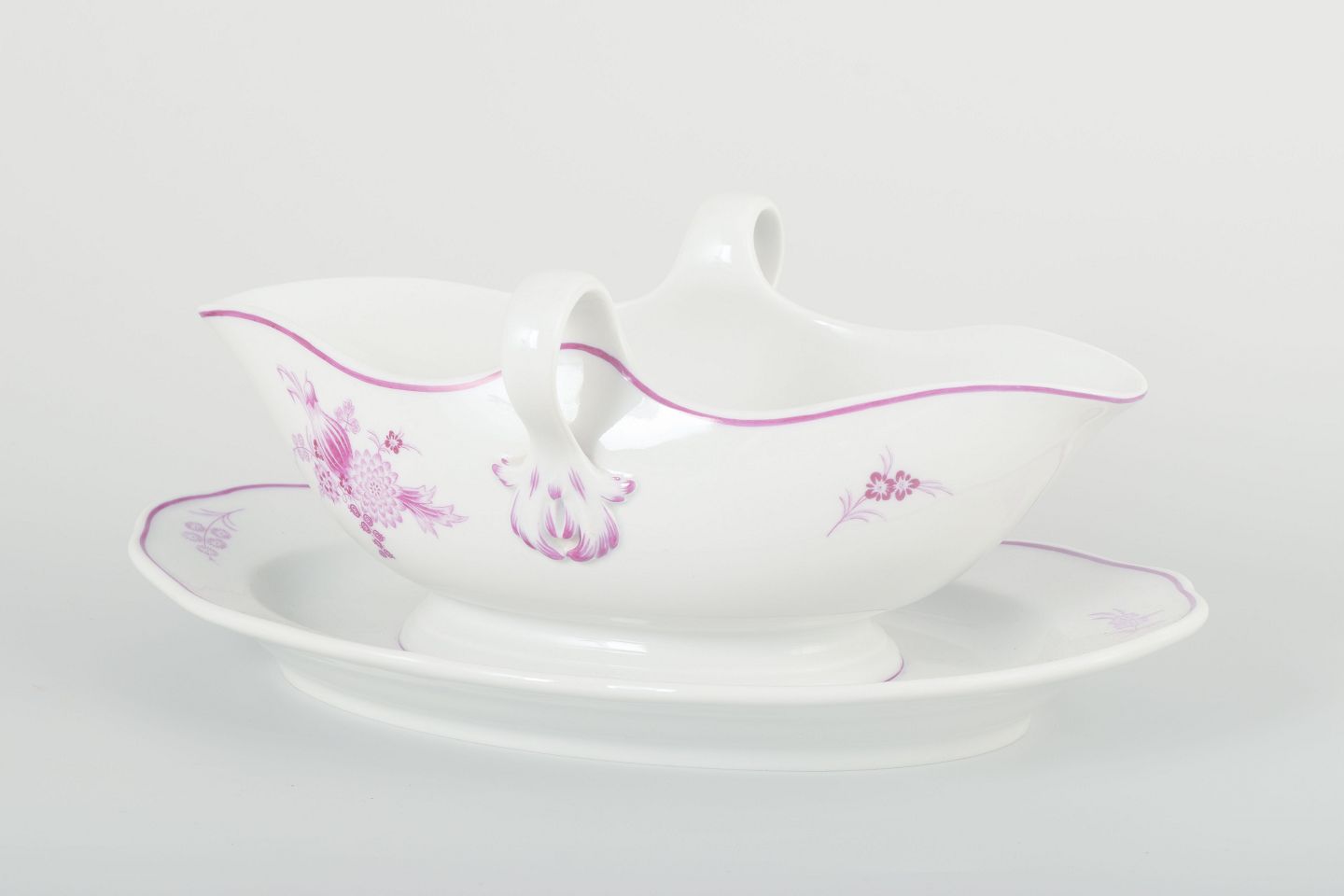 Håndmalet sovseskål i porcelæn med fastmonteret fad og dobbelt hældetud. Dekoreret med lilla blomsterkompositioner og elegant rosa staffering langs kanten. Klassisk Meissen-design i fin balance mellem funktion og æstetik.