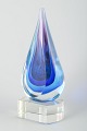 Håndlavet skulptur i klart og blåviolet glas, formet som en dråbe med optiske lag og elegant spids top. Monteret på rund fod i klart glas.