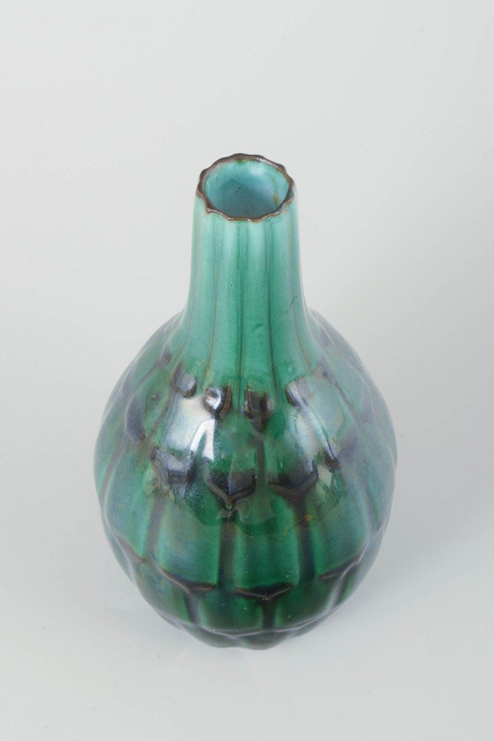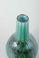 Lille dråbeformet vase i stentøj med blank grøn og blå glasur i lodret reliefmønster.