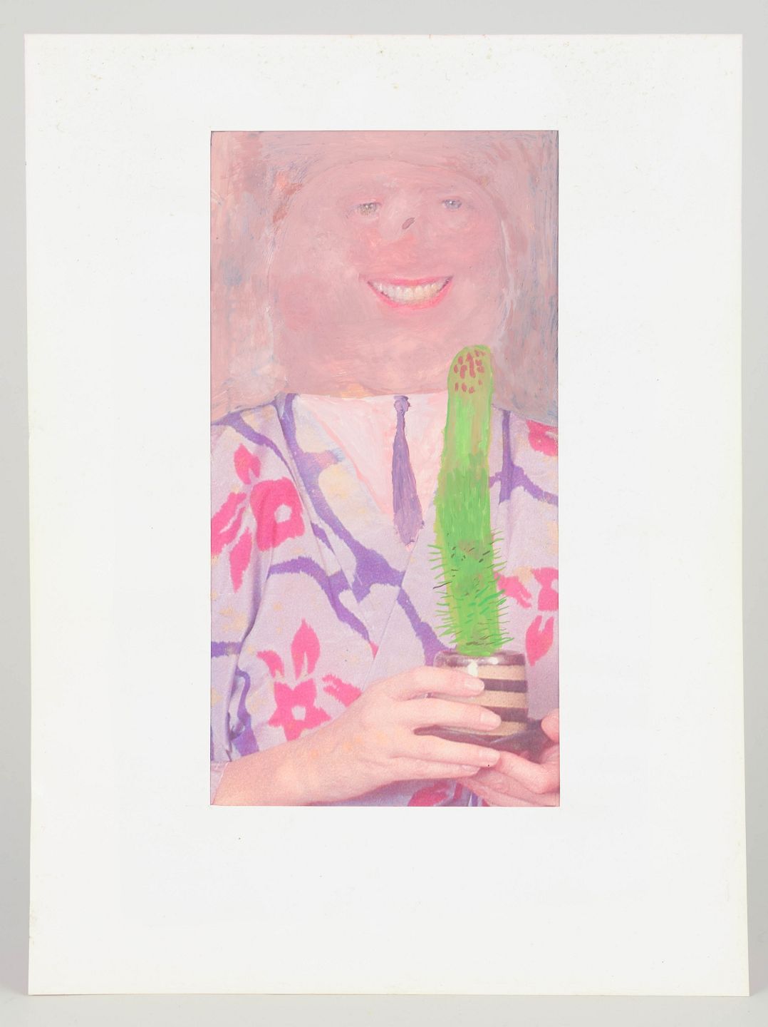Naivistisk og humoristisk portræt af en smilende figur iført mønstret kimono og holdende en kaktus i potte. Let surrealistisk præg med dekorativ farvepalet i rosa, lilla og grønne toner.