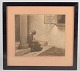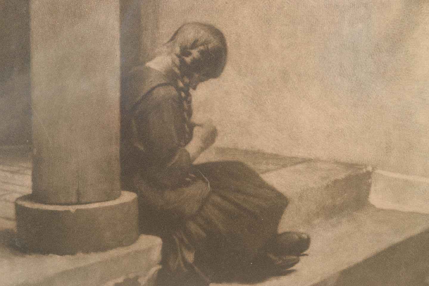 Stemningsfuldt interiørmotiv med en ung pige ved en søjle – gengivet i Ilsteds karakteristiske stille, lysmættede tonesprog. Den fint nuancerede mezzotinteteknik skaber et drømmeagtigt spil mellem lys og skygge og fremhæver den poetiske ro, som Ilsted er kendt for.