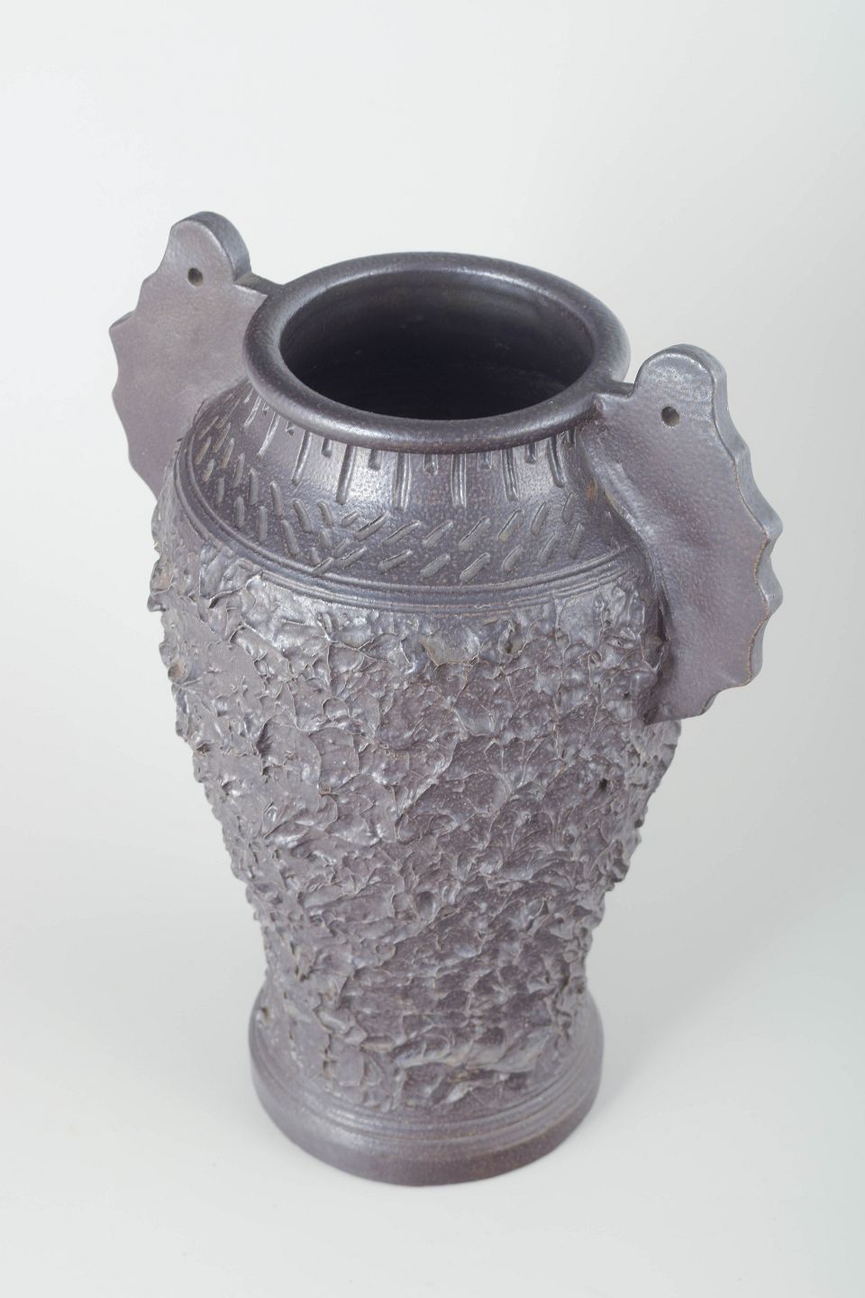 Art nouveau inspireret vase i terracotta med markant tekstureret overflade og formede hanke. Glasur i mørk, metallisk brun nuance, typisk for tidlige arbejder fra Höganäs Keramik.