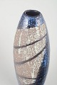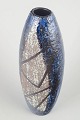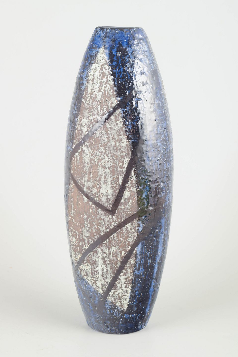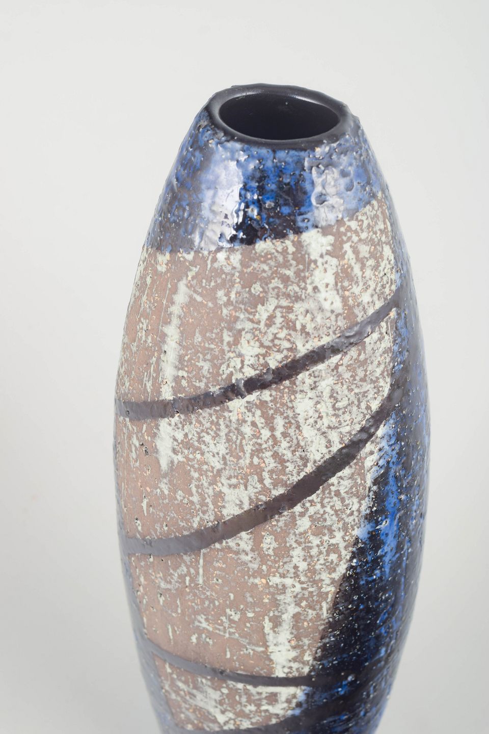 Tall sculptural stoneware vase with chamotte texture and striking textured glaze in blue, silver and earthy tones, decorated with abstract organic line motifs – a quintessential example of Atterberg’s modernist expression for Upsala Ekeby.