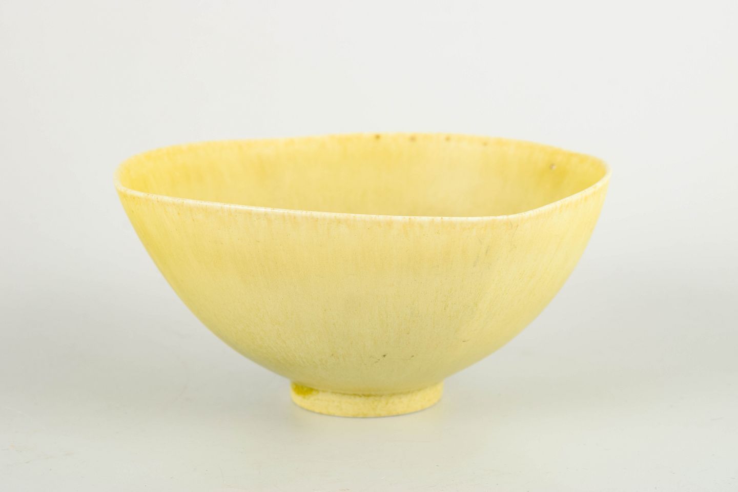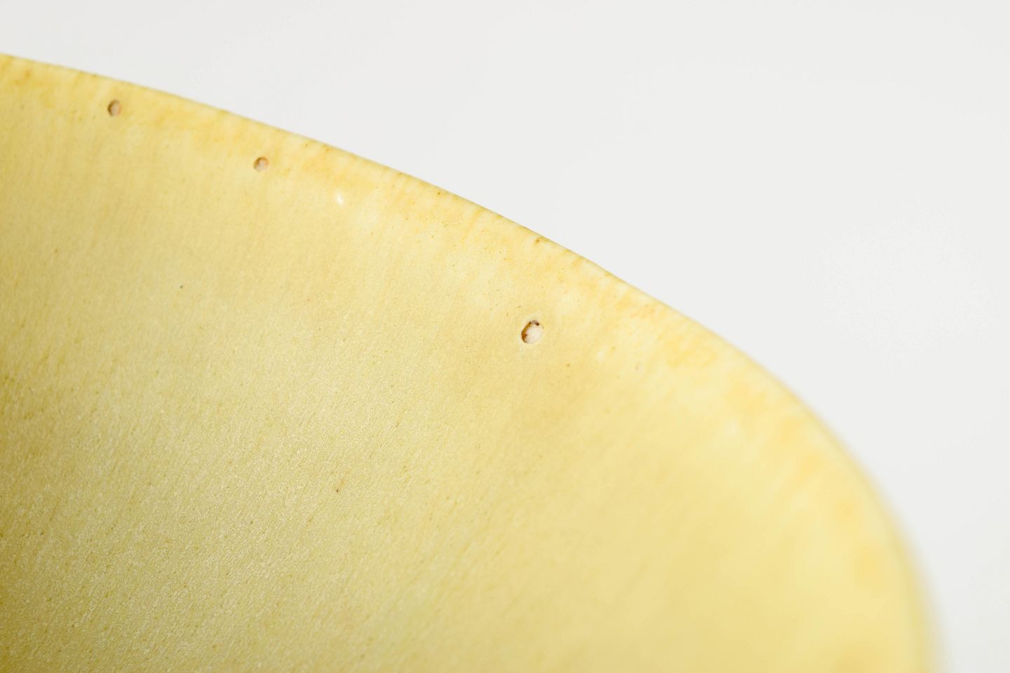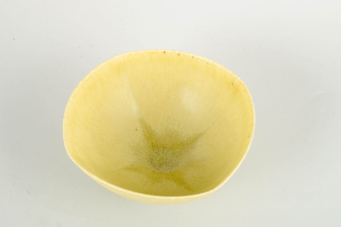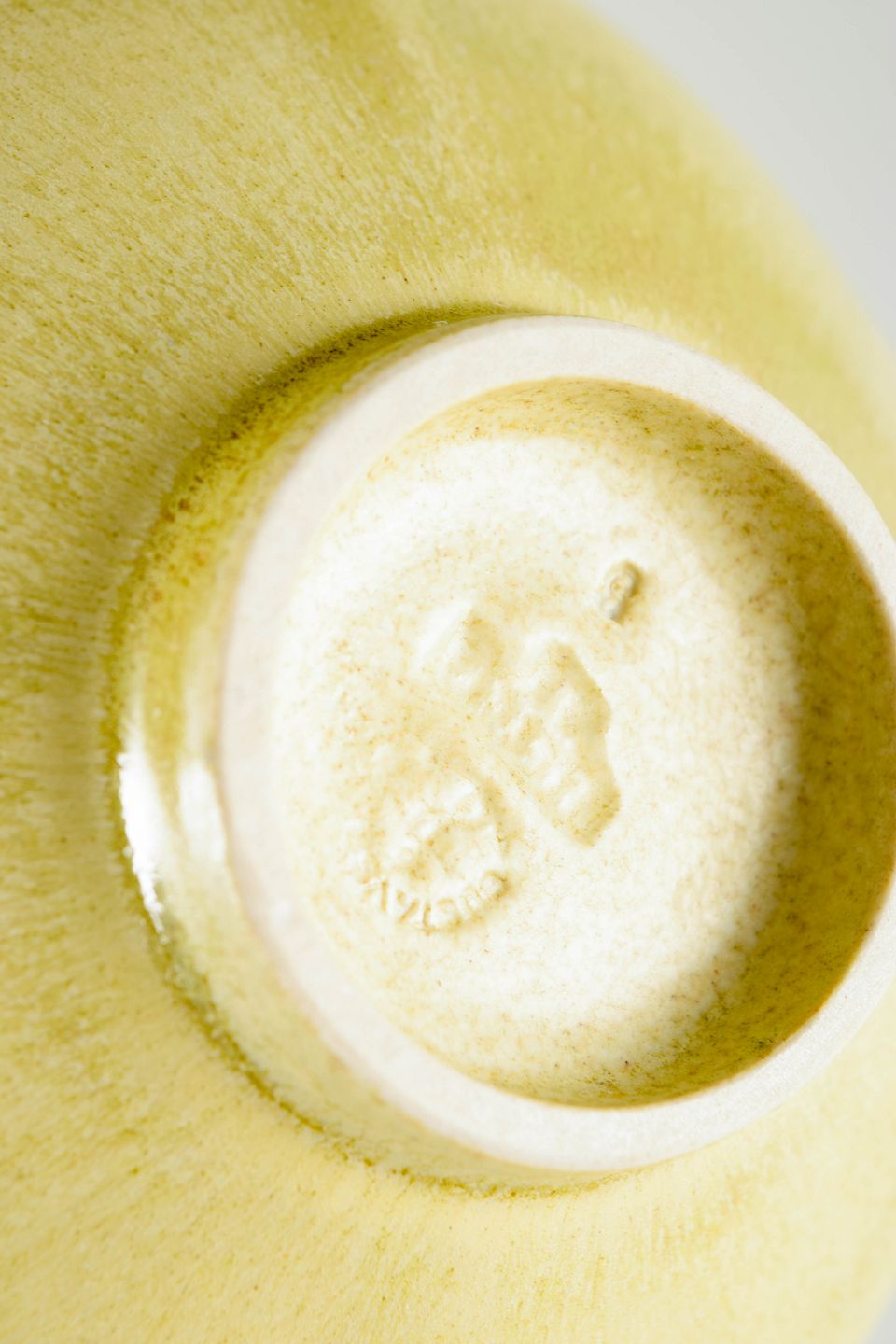 Hand-thrown small stoneware bowl with an elegant rounded form and characteristic warm yellow tenmoku glaze. Classic Friberg micro-glaze texture with small glaze bubbles from firing (see photo).