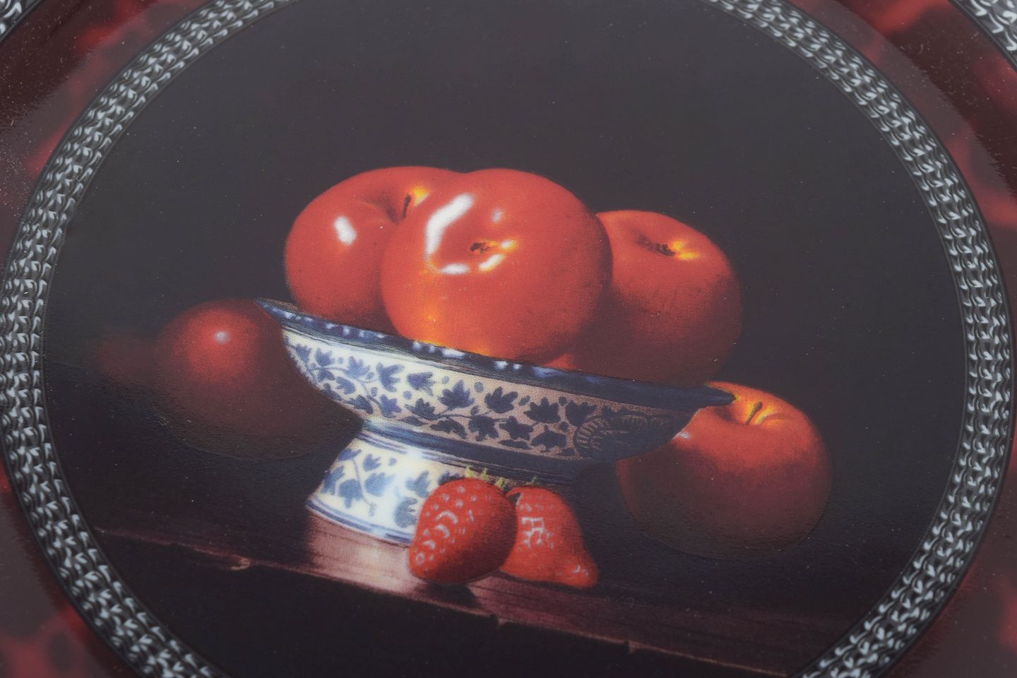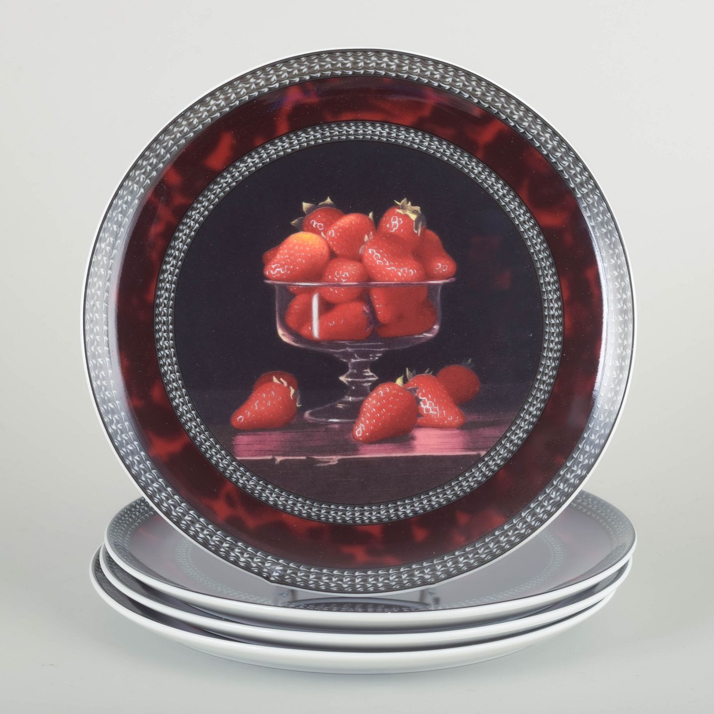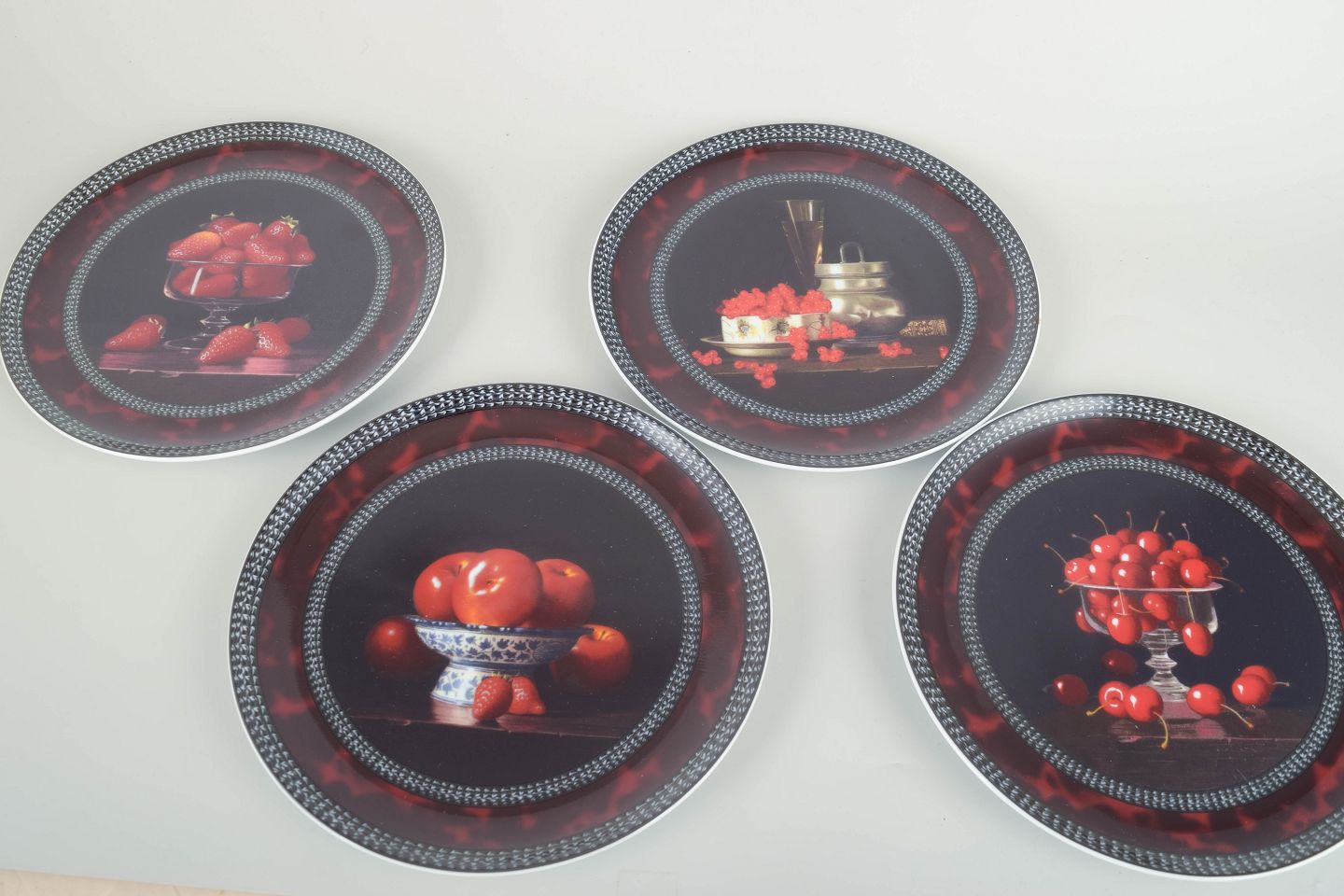 Dekorative porcelænstallerkener med fire forskellige frugtmotiver fra Chaurays originale værker, herunder kirsebær, jordbær og æbler. Hver tallerken er smukt udført med realistiske stilleben i dybe røde nuancer og mørk baggrund, indrammet af en dekorativ bort. Produceret af Bernardaud, Limoges – kendt for deres fornemme franske porcelæn.