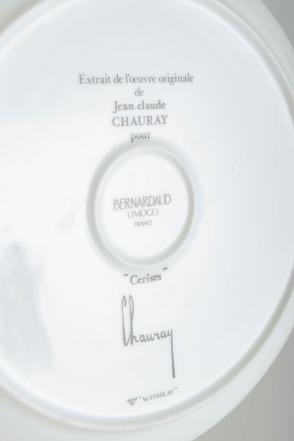 Jean-Claude Chauray (født 1934) var en fransk maler kendt for sine realistiske stilleben, ofte med frugt og glas som motiver, gengivet med en næsten fotografisk præcision. Hans samarbejde med Bernardaud resulterede i en serie af limiterede porcelæntallerkener, som i dag er eftertragtede samlerobjekter. Bernardaud, grundlagt i 1863, er et af Frankrigs mest prestigefyldte porcelænshuse, anerkendt for sin håndværksmæssige kvalitet og samarbejde med fremtrædende kunstnere.