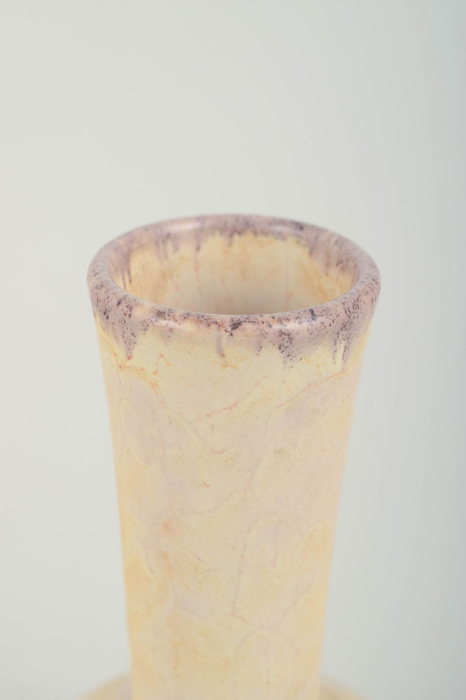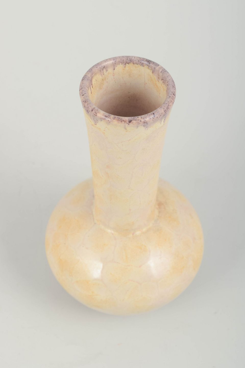 Håndlavet vase i glaseret stentøj med lysegul krakeléglasur og subtil violet nuance ved rand. Model 2762.