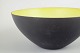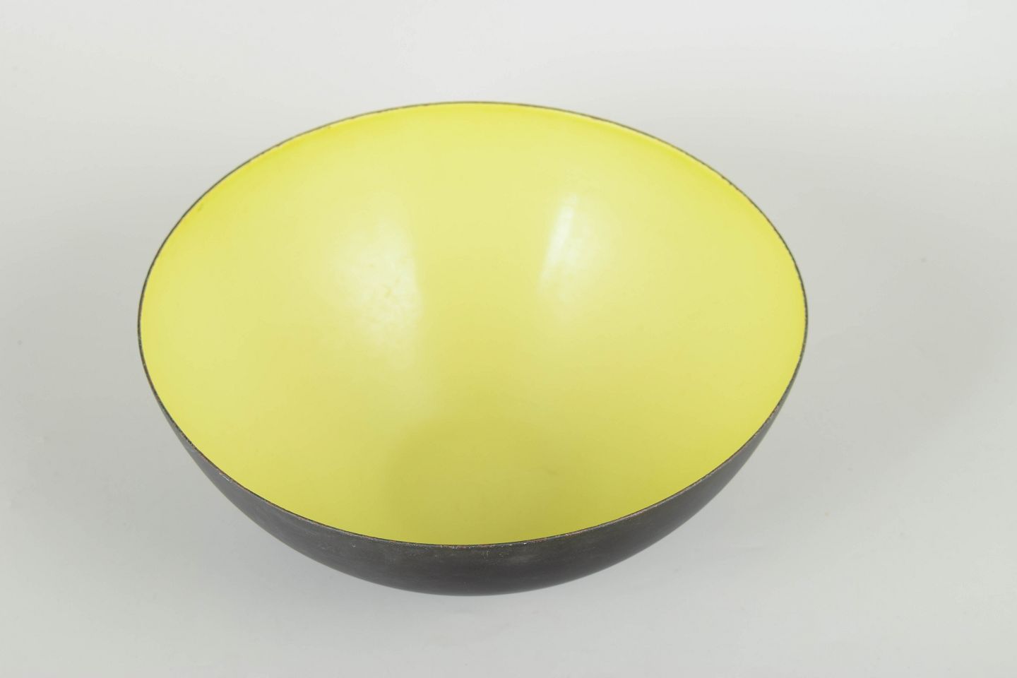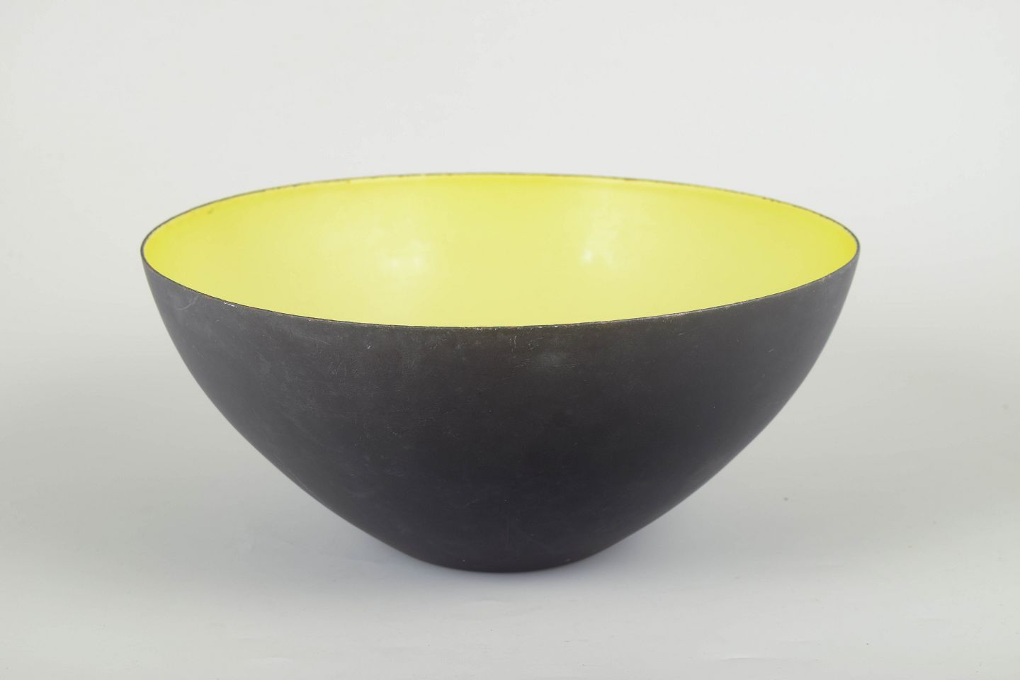 Classic Danish design bowl in black-lacquered metal with an enamelled interior in a rare yellow colour. The iconic hemispherical shape creates a sharp, minimalist expression characteristic of the timeless Krenit series.