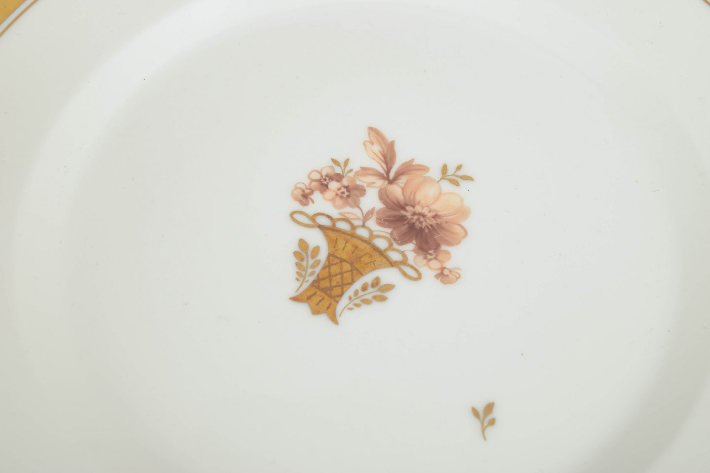 Sæt med seks elegante middagstallerkener i porcelæn fra Royal Copenhagens “Guldkurv”-serie, model 595/9586. Klassisk hvid porcelæn med bred forgyldt kant og håndmalet blomsterkurvmotiv.