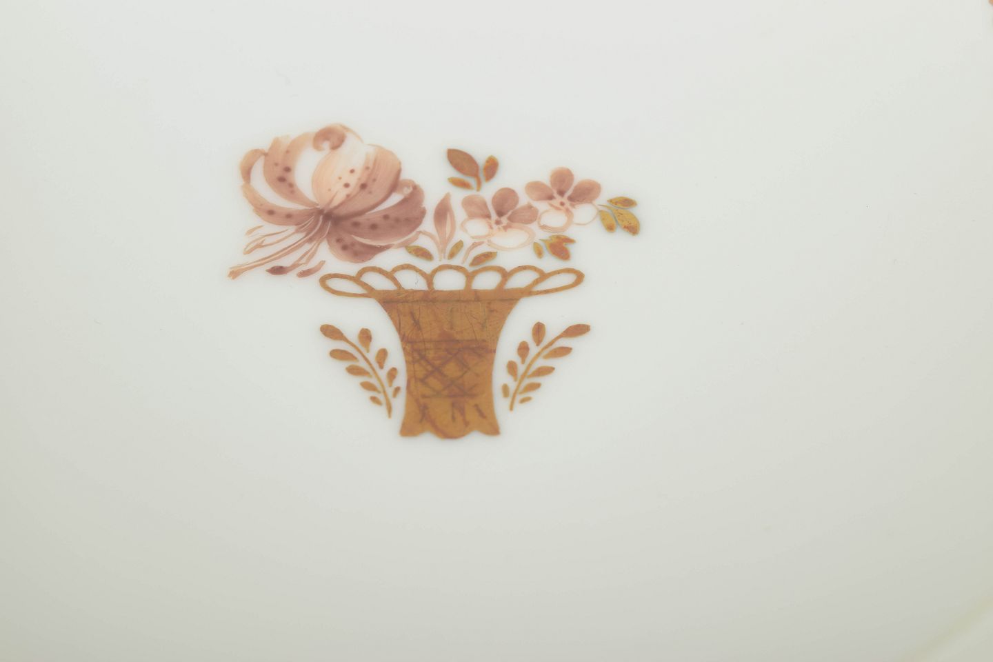par opsatser i porcelæn fra Royal Copenhagens “Guldkurv”-serie, model 595/9269. Begge udført med forhøjet fod, bred forgyldt kant og håndmalet blomsterkurvmotiv.