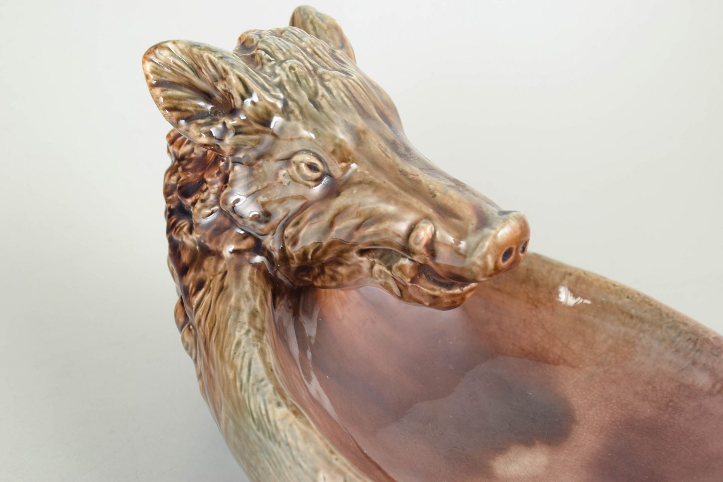 Skål i stentøj udformet som et vildsvinehoved med naturalistiske detaljer og glaseret i varme brunlige og rosa nuancer. Dekorativ og funktionel genstand med karakteristisk tidlig 1900-tals formsprog.
