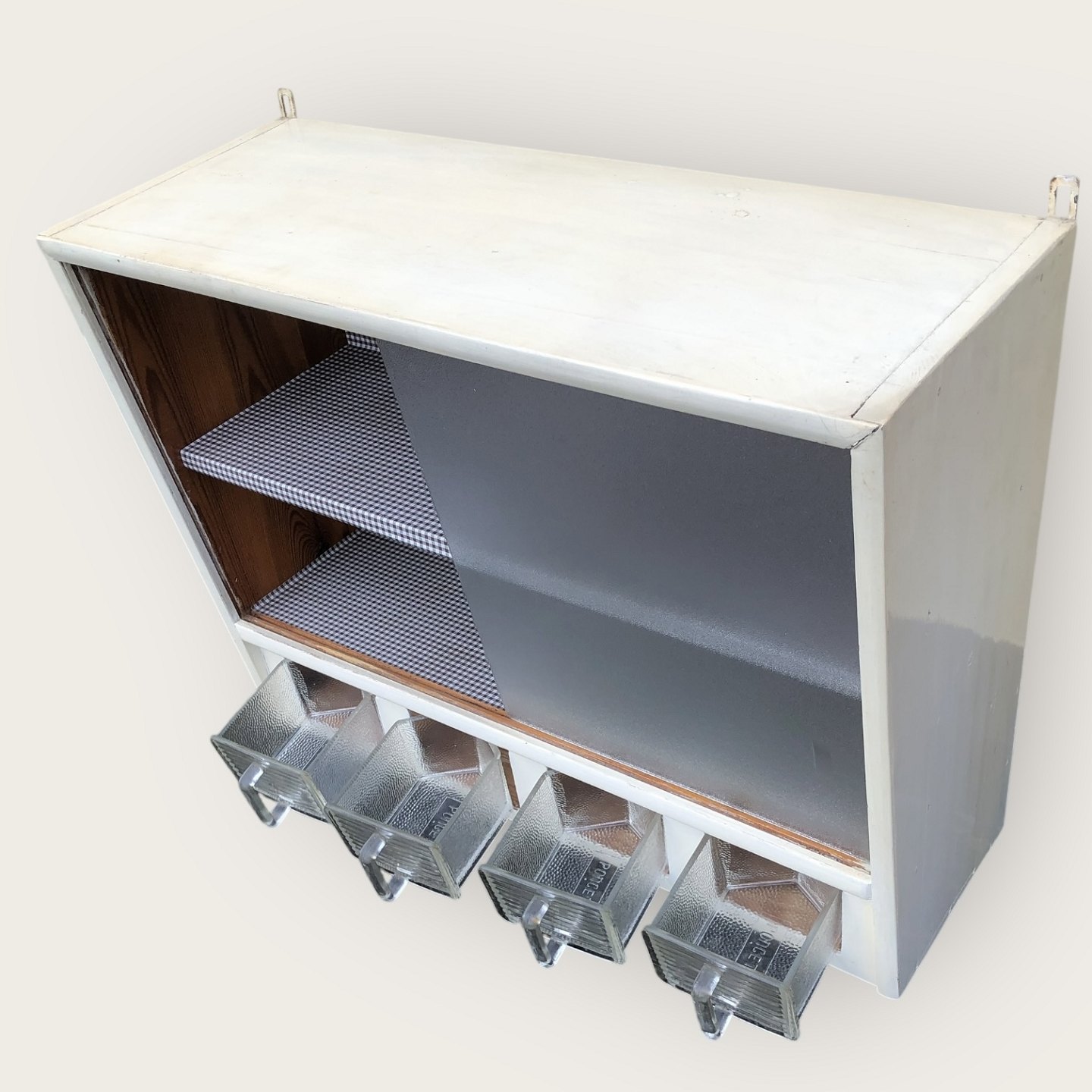 Hvidmalet køkkenskab med glasskuffer og desværre kun en glasskydelåge, pæn patineret stand, Mål HxBxD 62x80x31cm