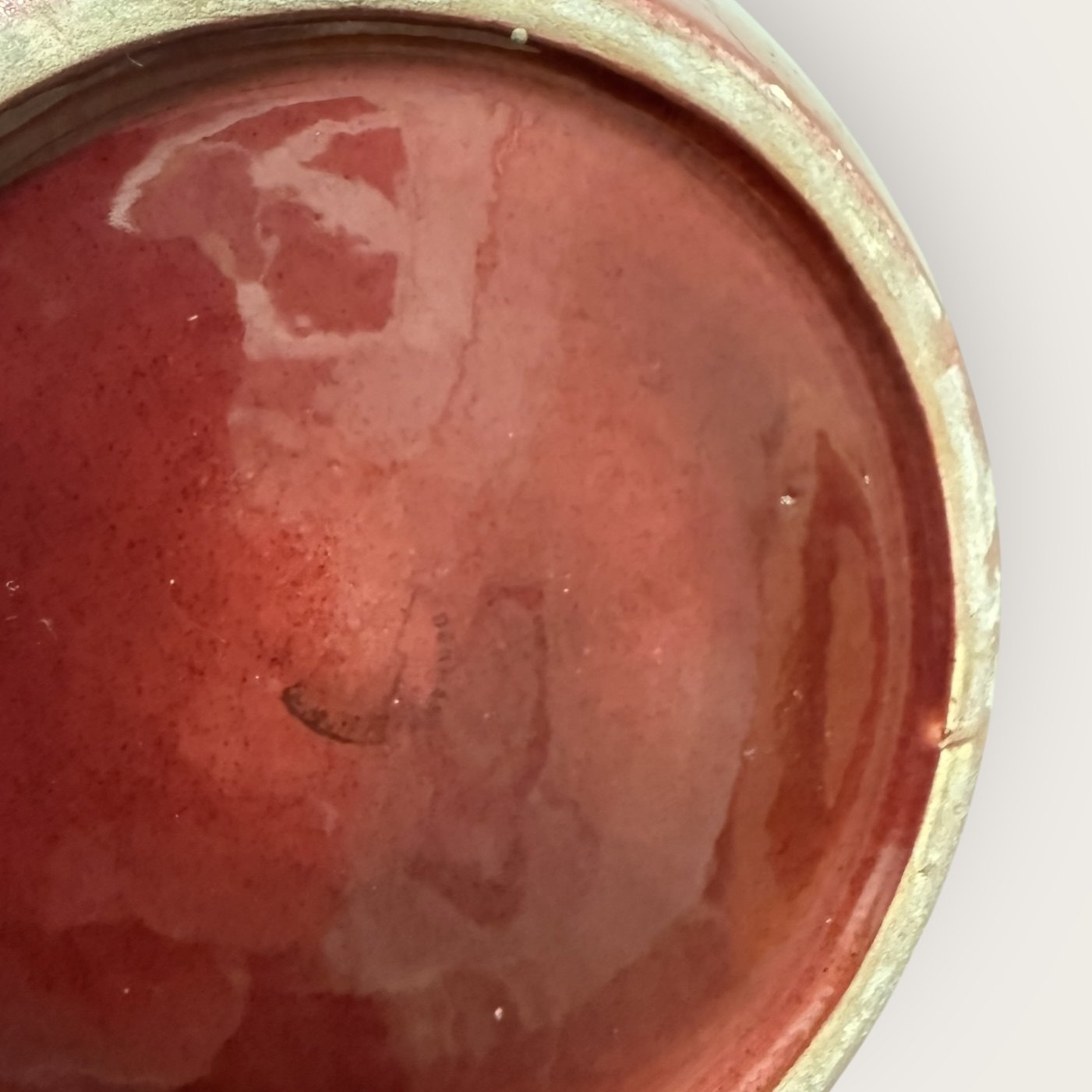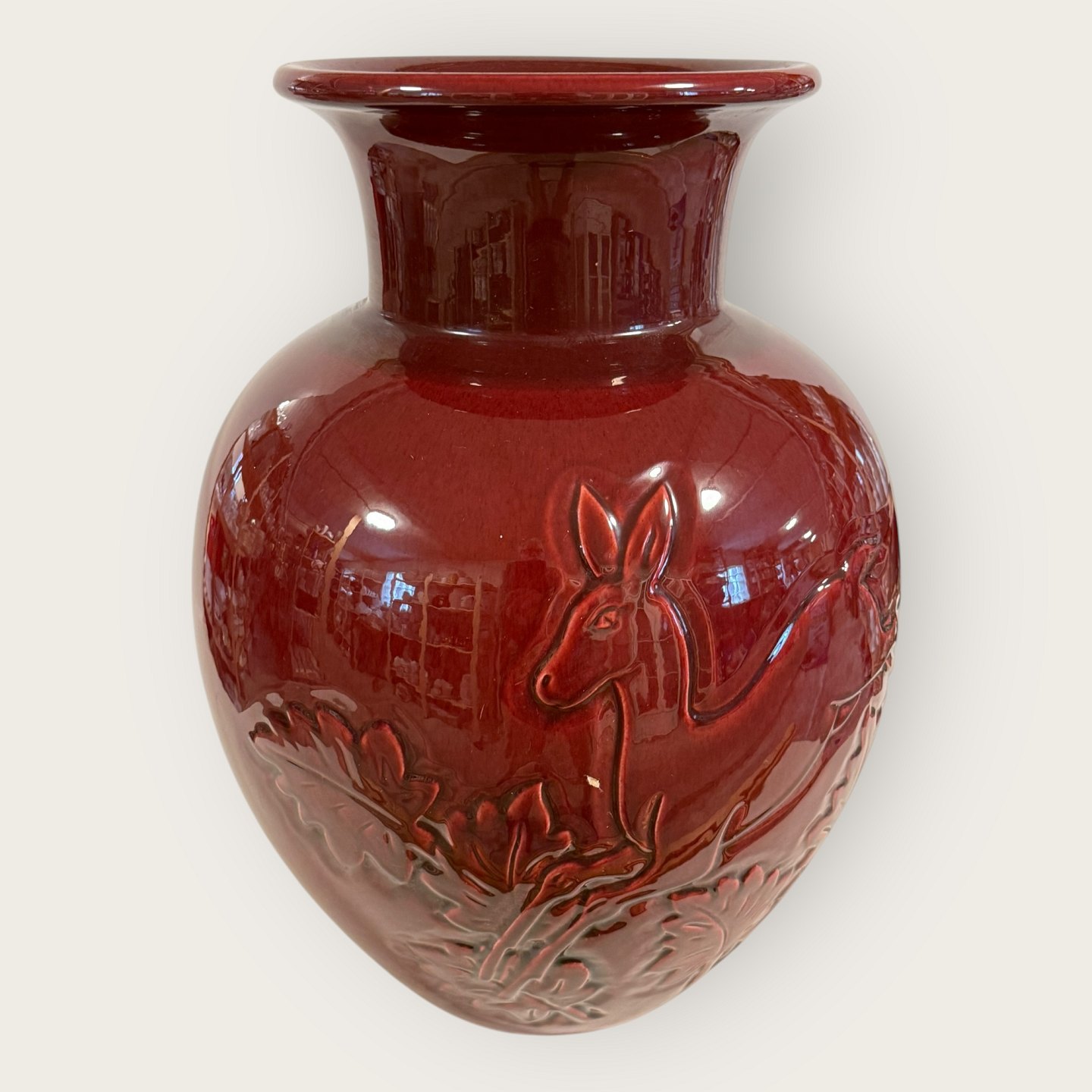 Stor gulvvase med springende hjort i okseblodsfarvet glasur fra Knabstrup keramik, Et enkelt lille afslag under hjortens hoved (se næstsidste foto) ellers pæn brugt stand, højde 41cm