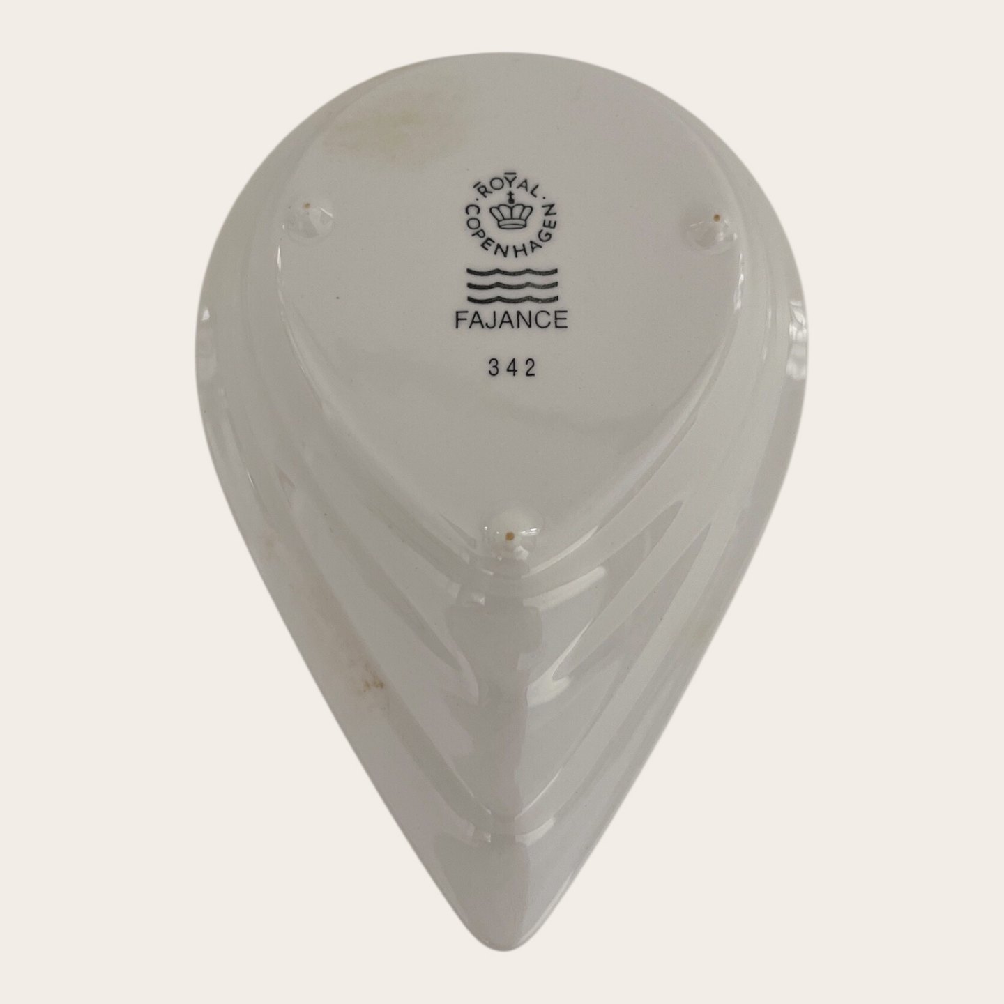 Royal Copenhagen, Aluminia, Dråbe skål / Låg til kande (varenr. 629133) Hvid #342, 1. sortering, 13cm lang, 8,5cm bred, Design Ursula Munch Petersen *Pæn stand med lettere brugsspor*