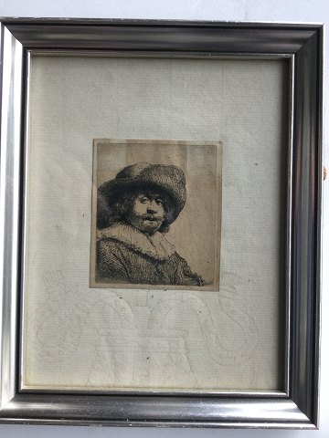 Rembrandt van Rijn (1606-69): Portræt 1638 - "Man in a Broad-Brimmed hat" Kobberstik på papir. Beskåret tæt på pladen Antagelig senere tryk. Usigneret Plademål 8x7 Indrammet 20x16 19325