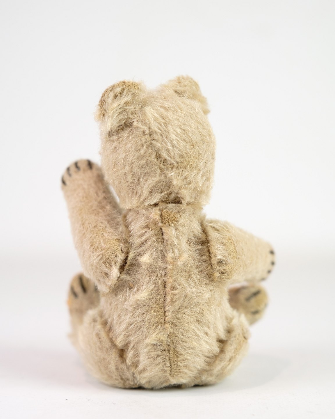 SoldOld teddy bear in beige mohair. The teddy bear has black glass eyes, an embroidered nose and paws with sewn details. The feet show clear signs of use and patina. A nice little collector's teddy bear with an authentic expression.