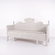 Antik slagbænk 1860’erne i gråmalet fyrretræ med udskårne detaljer og opbevaring. Antik opbevaringsbænk 1800-tallet.