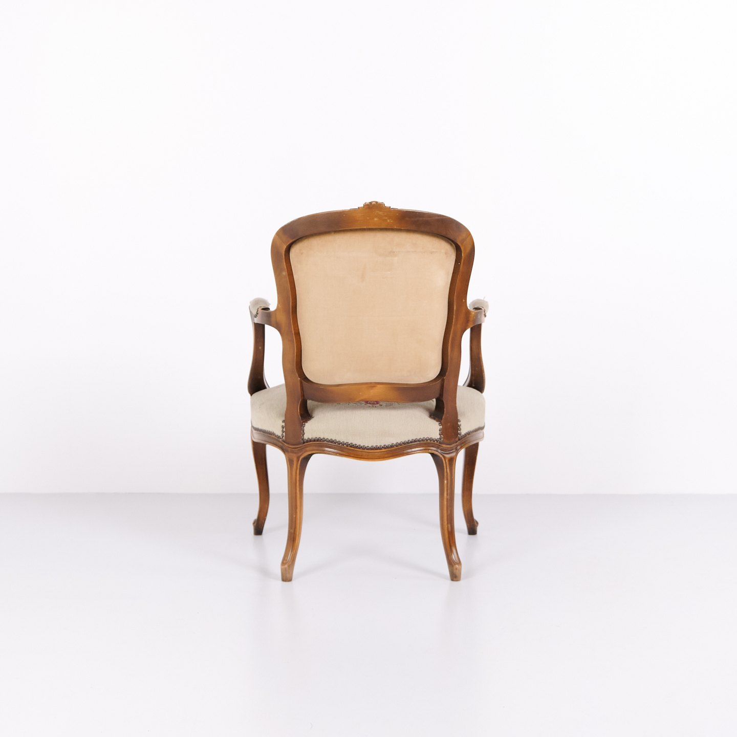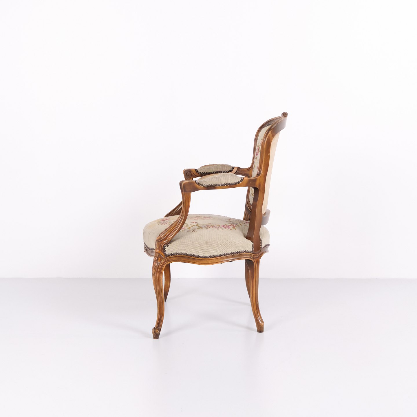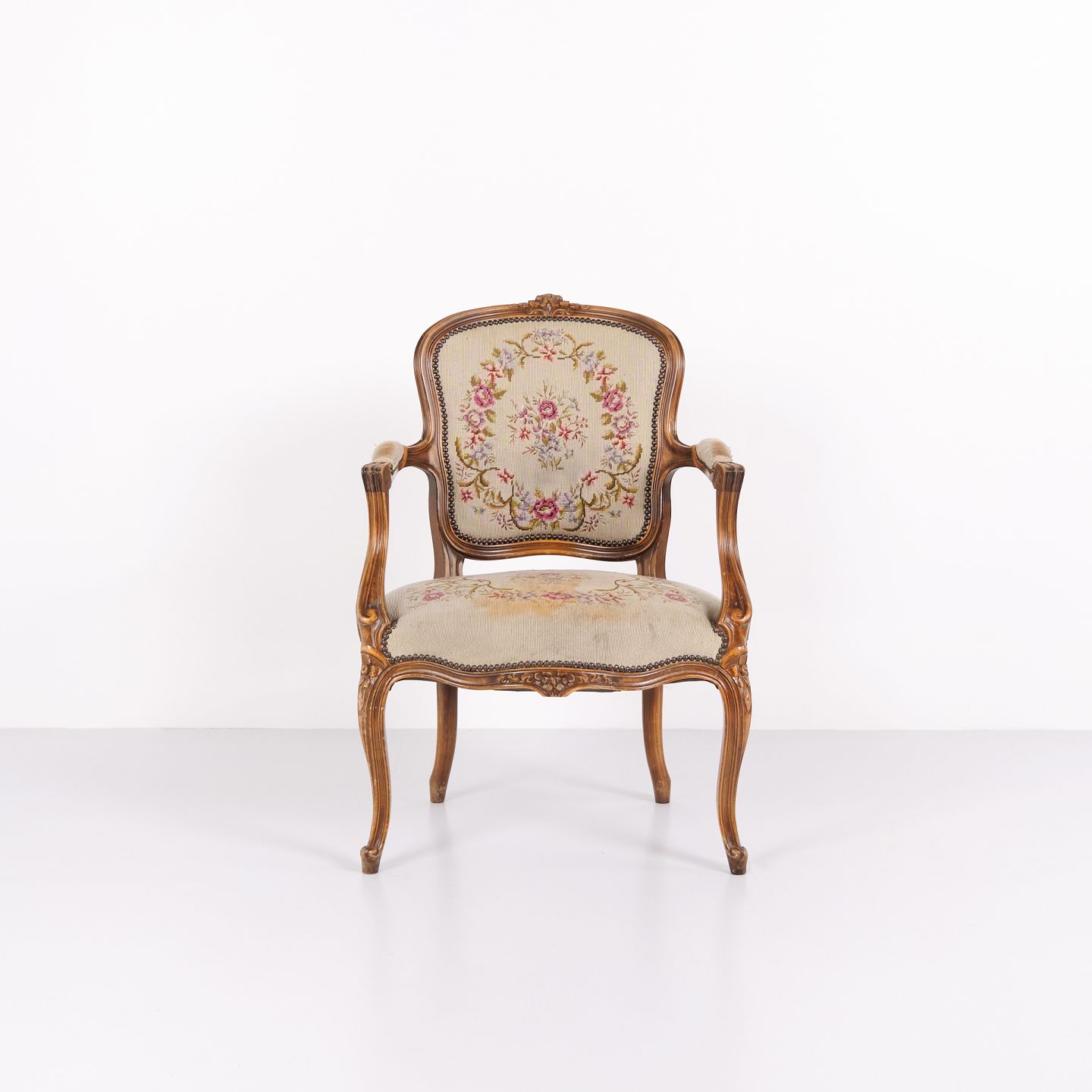 Nyrokoko armstol fra 1930’erne med buede ben og blomstret stof. Klassisk og dekorativt møbel med romantisk udtryk.