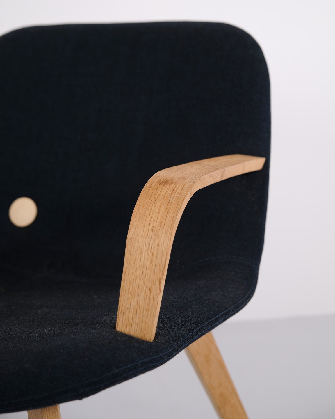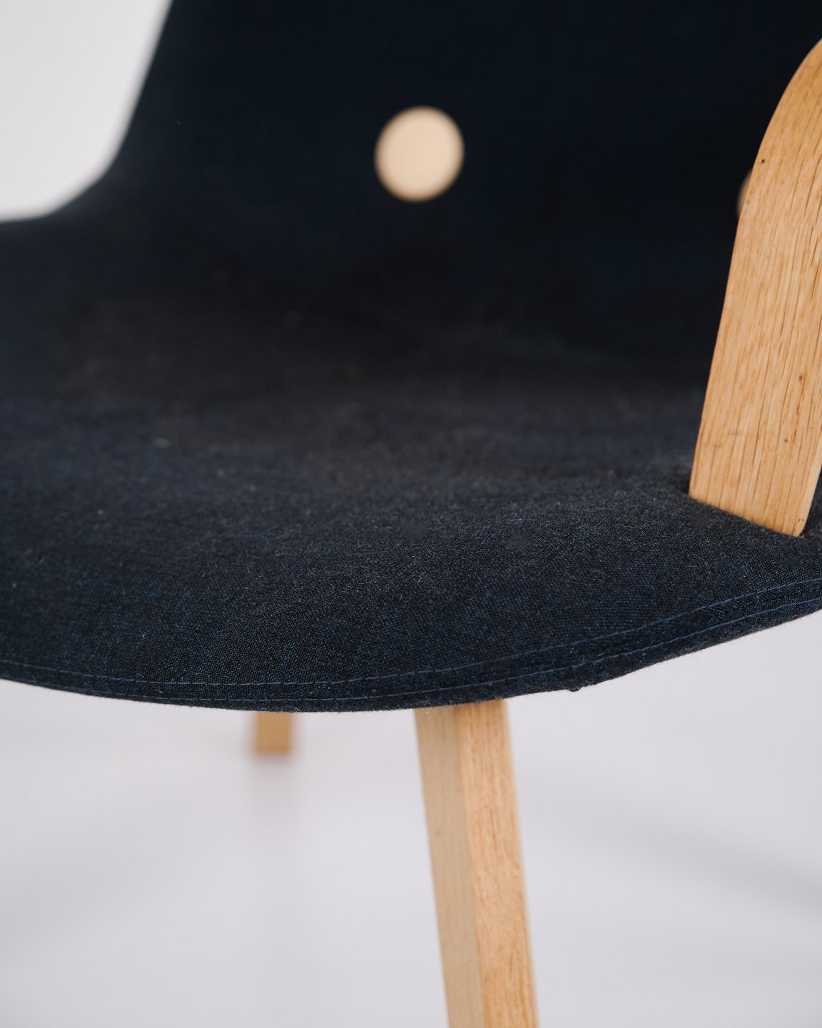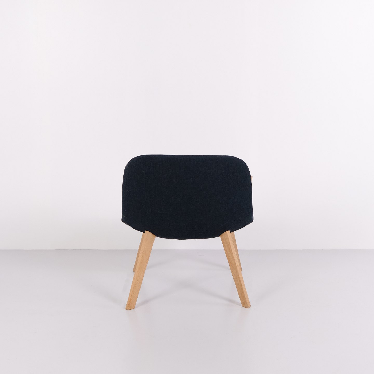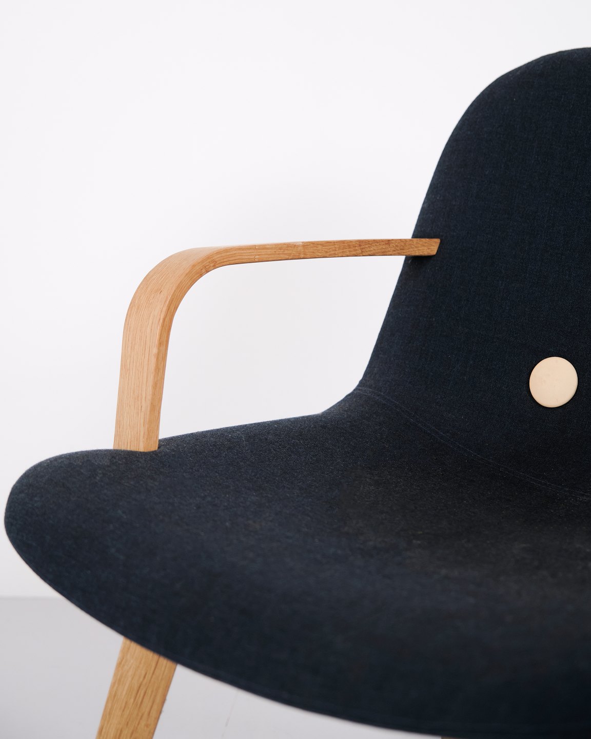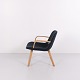 Fauteuil lounge Erik Jørgensen modèle EJ 3 en chêne et tissu bleu. Design danois avec un langage de forme simple et intemporel.
