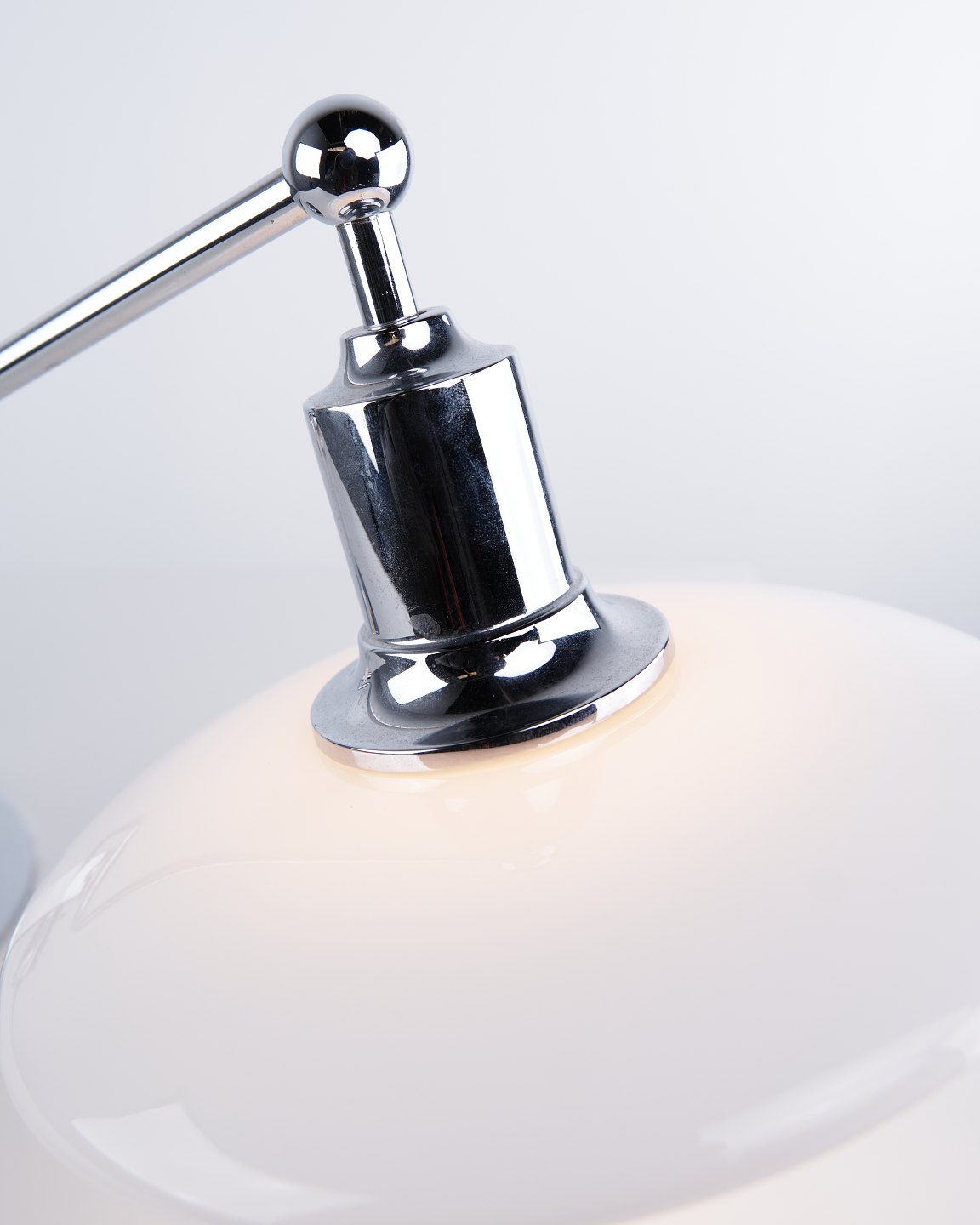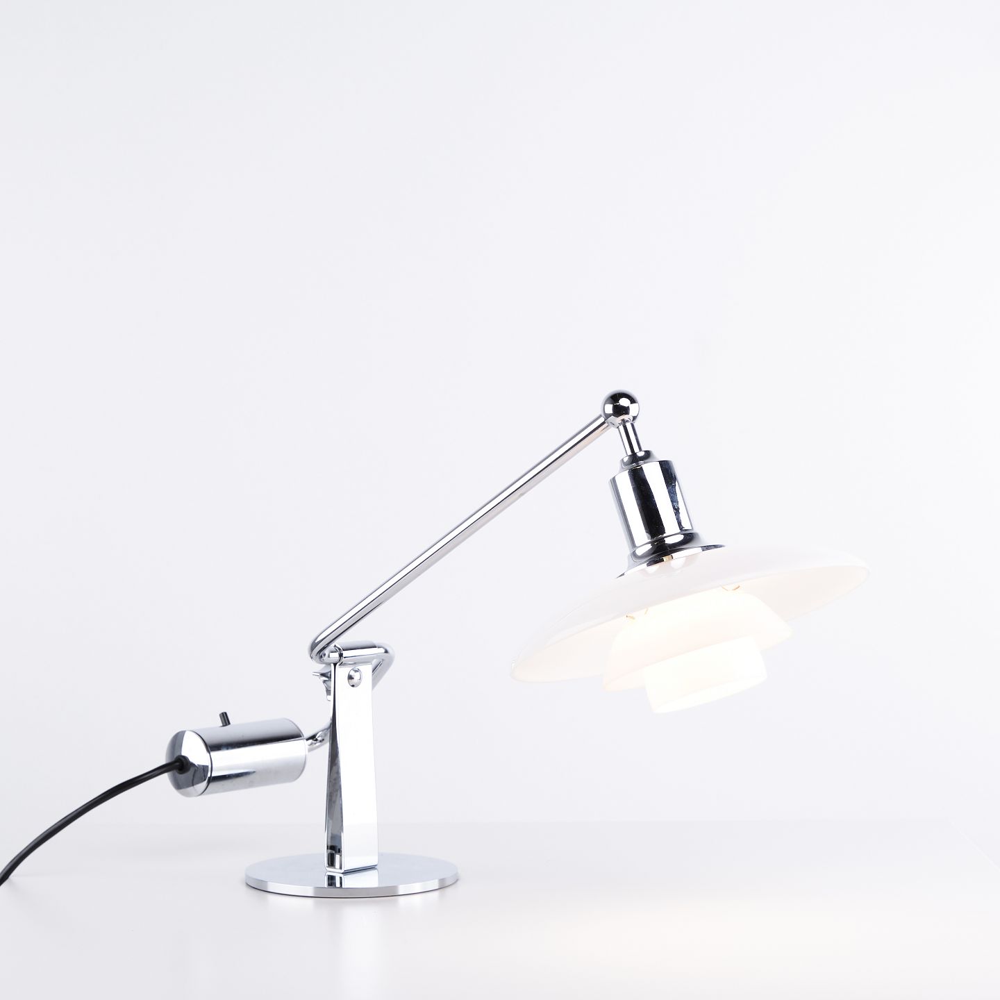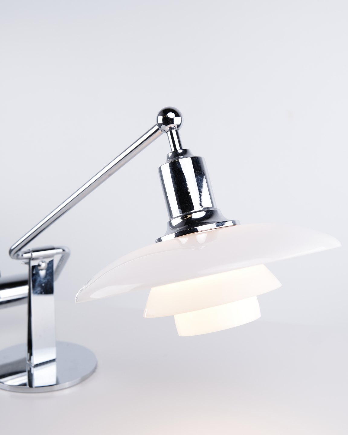 PH 2/1 Klavier-/Kipplampe, entworfen von Poul Henningsen und hergestellt von Louis Poulsen. Die Lampe ist mit Schirmen aus weißem Opalglas und einem verstellbaren Arm ausgeführt, der eine flexible Lichtausrichtung und ein weiches, blendfreies Licht ermöglicht.