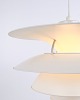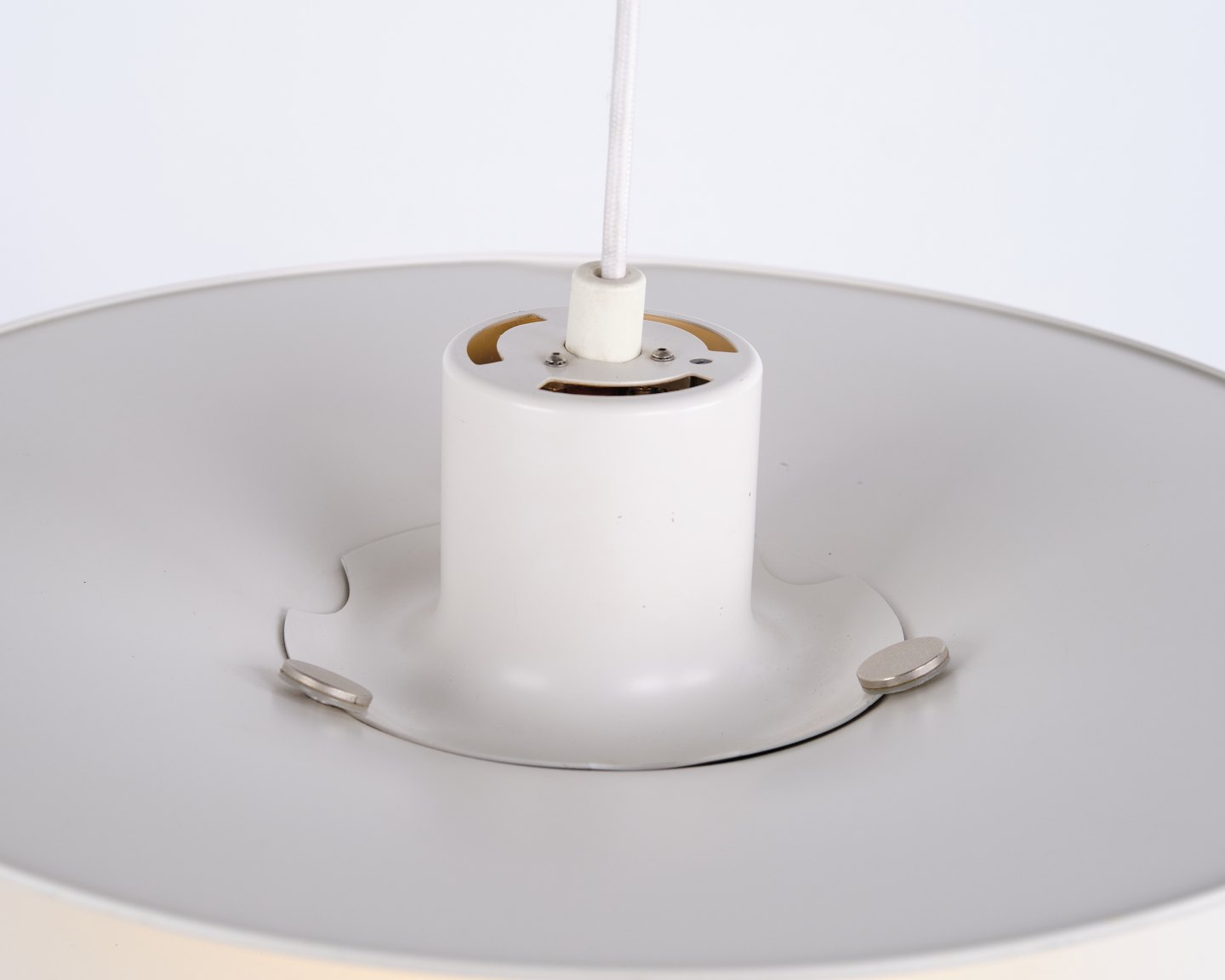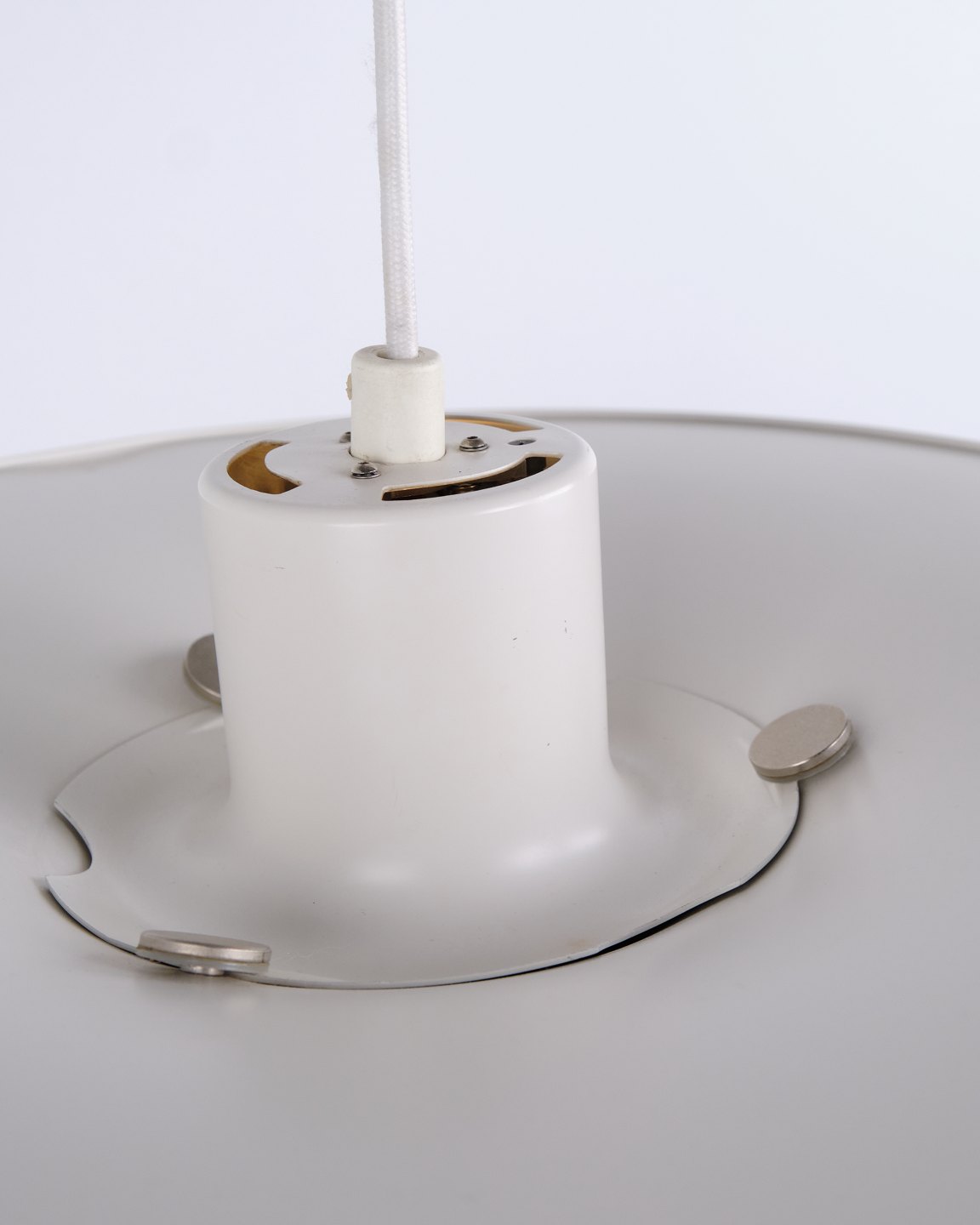 Suspension Charlottenborg, modèle PH 5-4½, conçue par Poul Henningsen et fabriquée par Louis Poulsen dans les années 1980. La lampe est basée sur le système à 4 abat-jours introduit en 1931 dans le but d’augmenter le rendement lumineux et de créer un éclairage plus efficace dans l’espace. La construction diffuse une plus grande quantité de lumière horizontalement, offrant un meilleur éclairage des murs et de l’environnement par rapport aux lampes traditionnelles à 3 abat-jours.