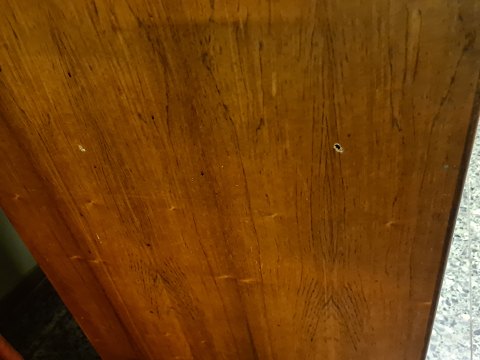 3 dørs skydelåge klædeskab fra 1960'erne i finéret palisander. Fremstår uden overskab, og med uoriginal bund i venstre side (billede) plus et par skruehuller ligeledes i venstre side. (Billede)