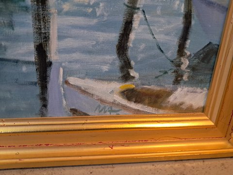 Maleri af Dragør Havn i guldmalet ramme, af : Mogens Amdi Thorsen (1924-2016)