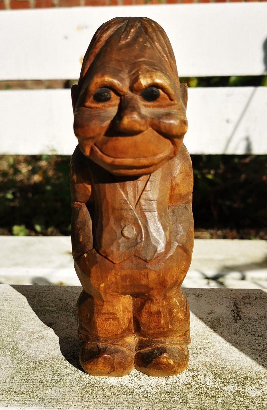 Håndskåret træfigur af mand med hænderne i bukselommerne. Tidlig træskærer arbejde af Thomas Dam, mærket DAM. Fremstår i god stand uden skader eller reparationer. H. 20 cm.