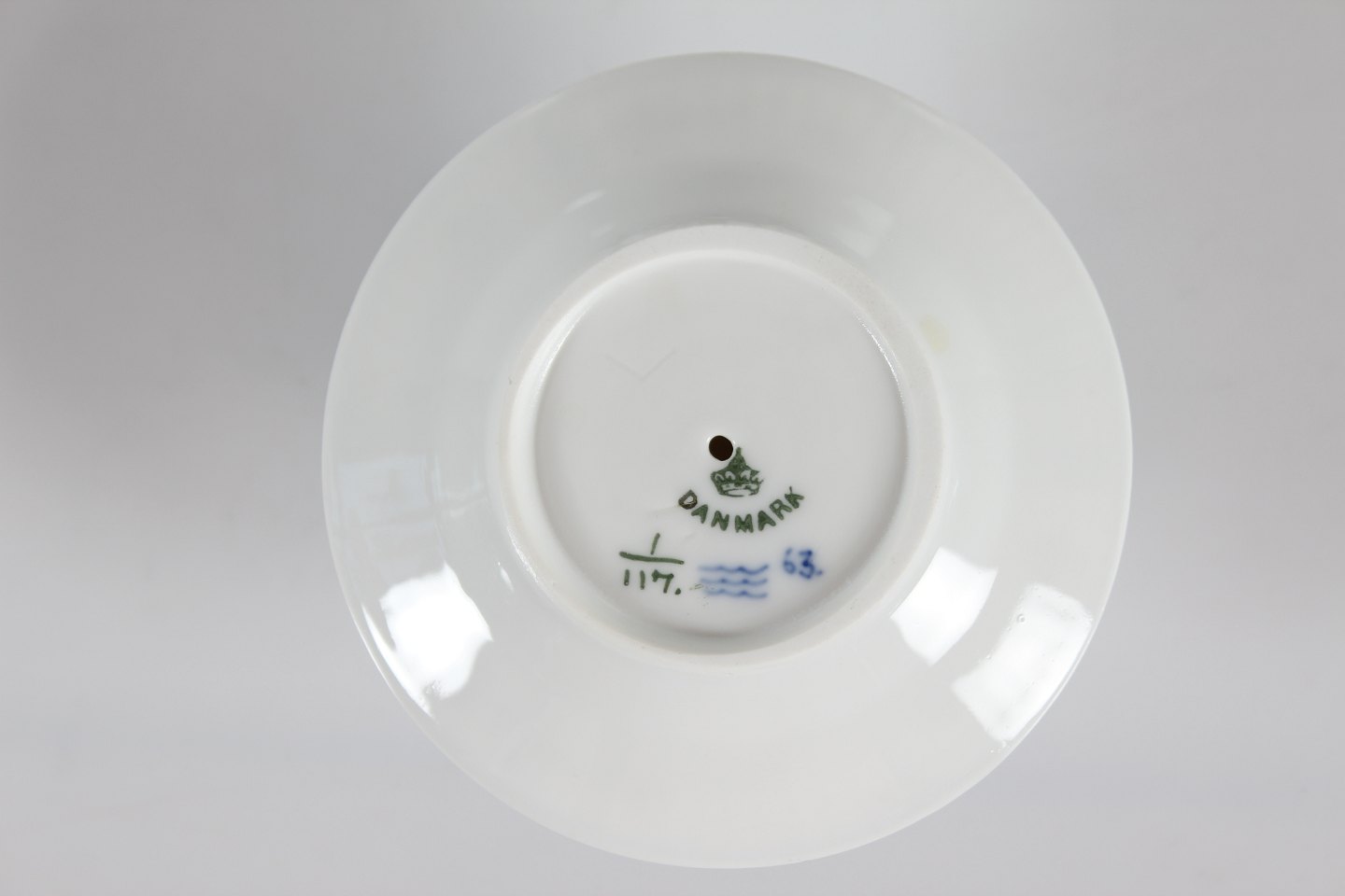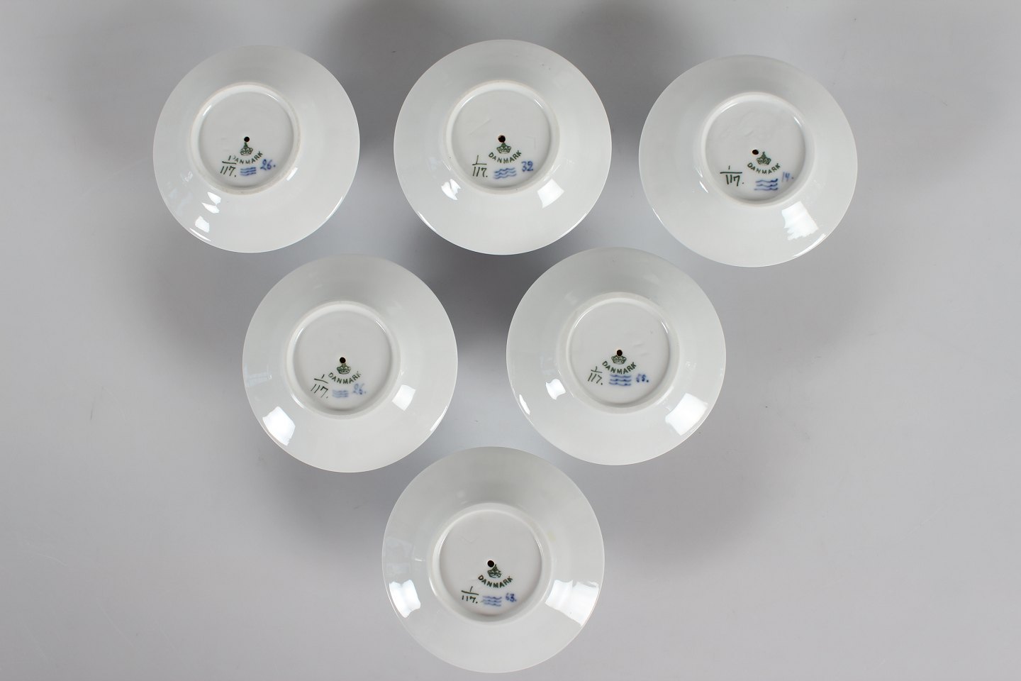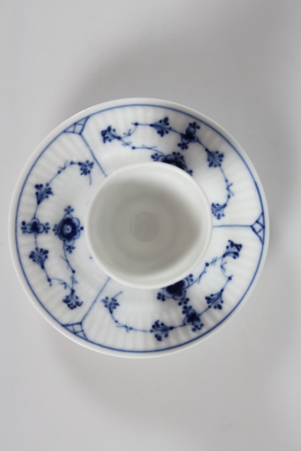 Royal Copenhagen Musselmalet Riflet Sæt på 6 sjældne æggebægere m/fasttilknyttet undertallerken nr. 1/117 Med stempel fra perioden 1893-1900 Diameter 10,5 cm Højde 6 cm 1. sortering Fin fejlfri stand uden skår eller revner