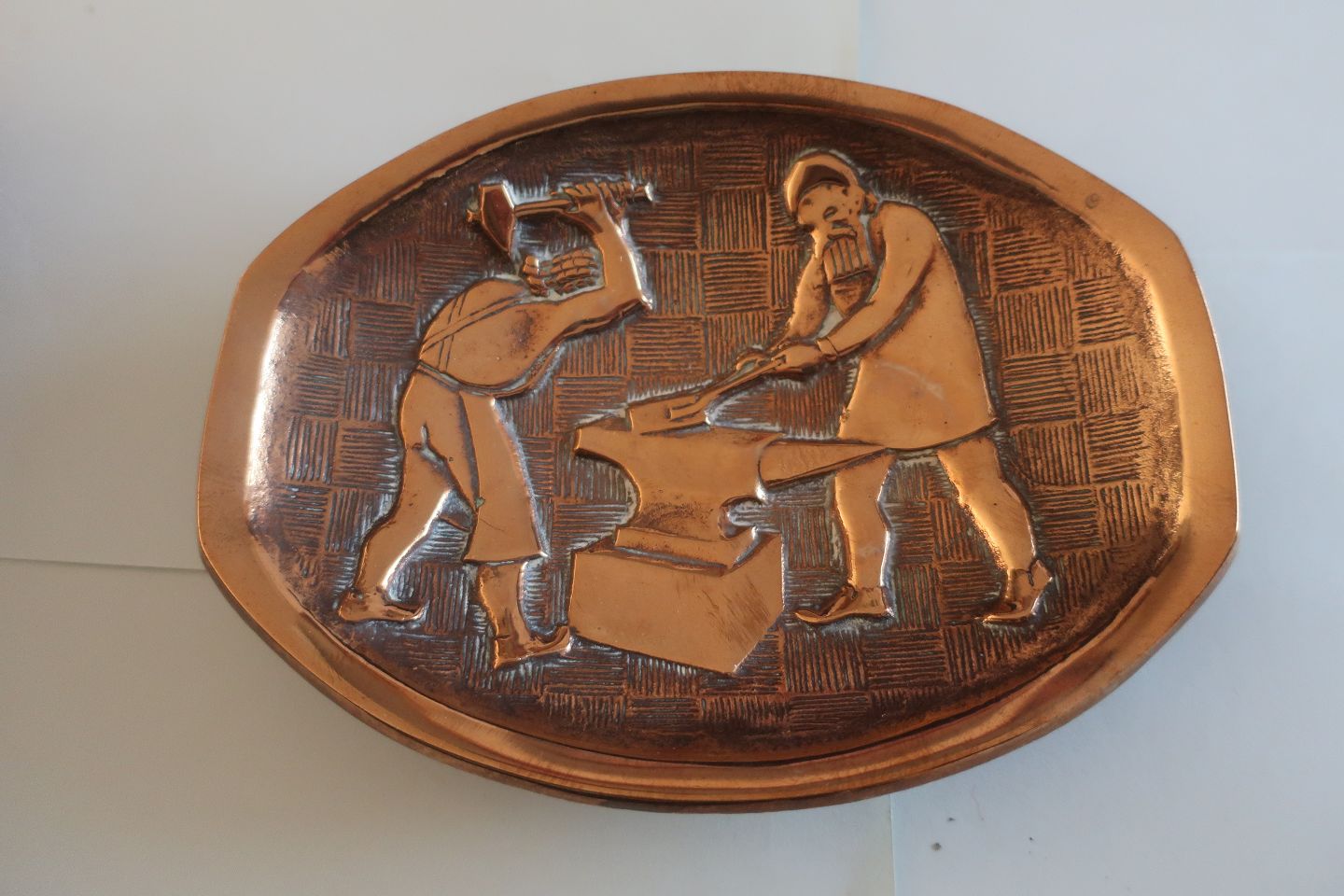 Oval platte/fad/lille skål i ædelmetal (messing) Relief illustreret som 2 smede i arbejde H: 13cm B: 16,5cm Tung Fremstillet i Danmark Meget flot stand Varenr.: KM1005