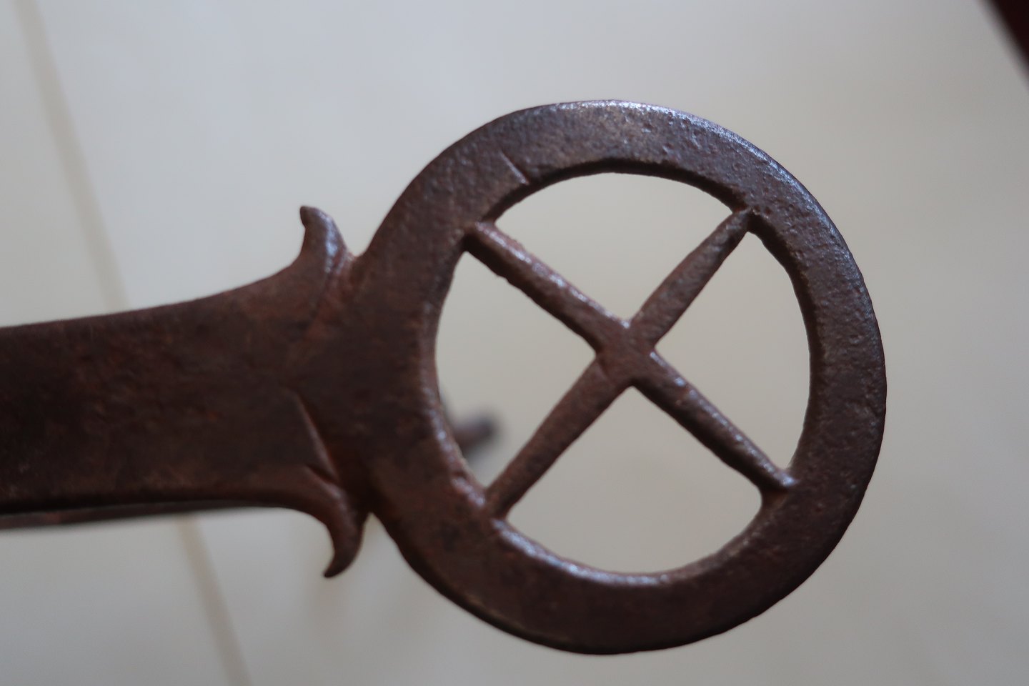 Dette pibejern har, som de antikke pibejern typisk havde, et lille cylinderformet rør, hvor den opvarmede jernbolt (se foto) stikkes ind.