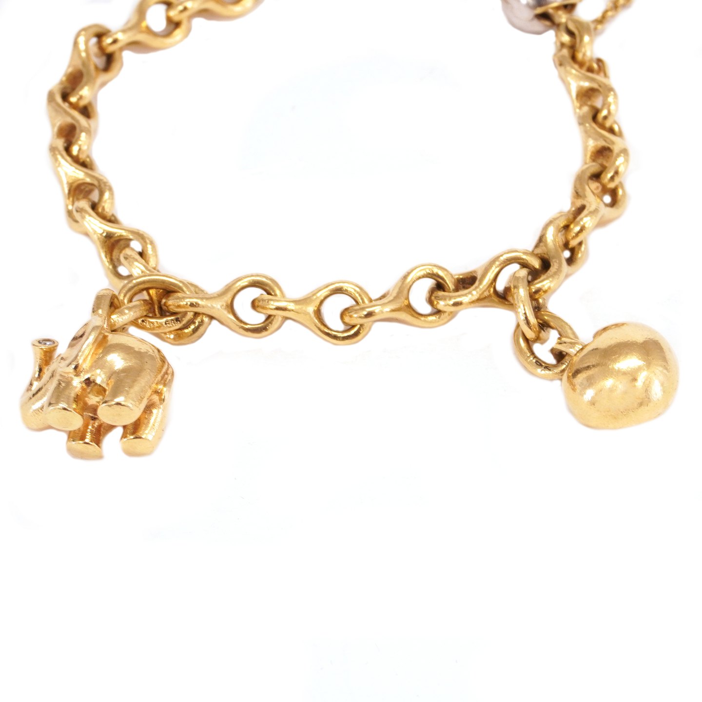 Ole Lynggaard 8-tals armlænke i 14kt guld med charms i form af elefant og hjerte. Kuglelås delvist hvidguld