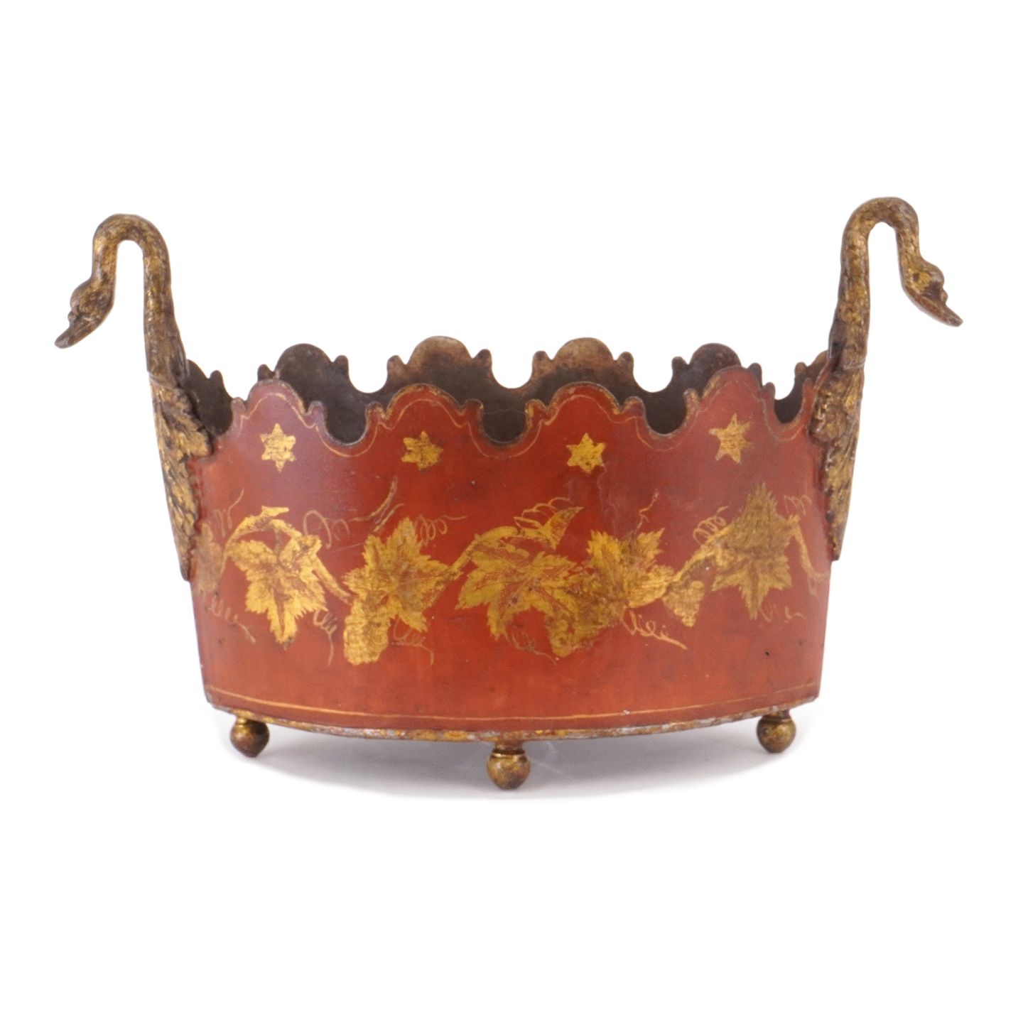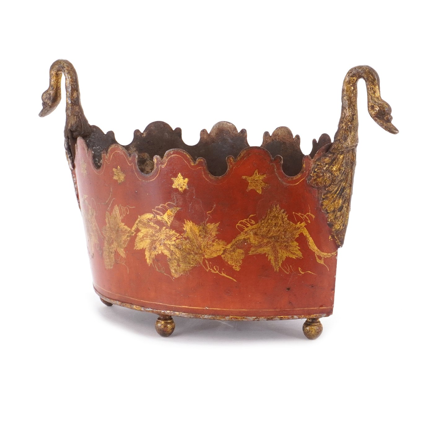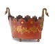 Forgyldt og røddekoreret urtepotteskjuler/jardiniere i metal. Frankrig ca. år 1840. H: 19cm. L: 31cm