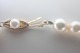 Halskæde i hvide saltvandskulturperler 7,3 mm., trukket med meget lille knude ml. perler og monteret med lås i 14 karat guld prydet med en mindre perle. Længde: 43,5 cm.. Samlet vægt: 31 gram. I fin nærmest ubrugt stand.