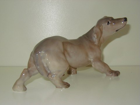 Denne flotte figur af en gravhund er fra Royal Copenhagen og har dek. nr. 1238/1450, 2. sortering (pga. lille glasurafslag på næsen). Figuren måler 18,5 cm. En sjælden figur.