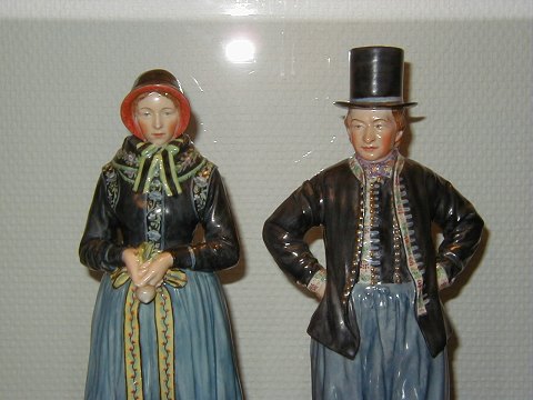 Et par store og sjældne kongelige overglasur figurer af Amagermand og kone (SOLGT) i torvedragter. De har dek. nr. 12102 samt 12103. De måler henholdsvis 31 og 32 cm. Begge er 1. sortering.